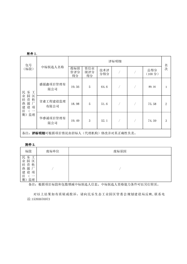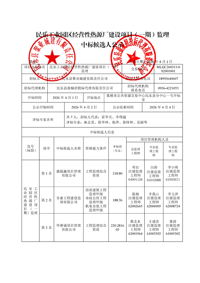 [民乐县]民乐工业园区经营性热源厂建设项目(一期)监理中标候选人公示[交易结果公示]