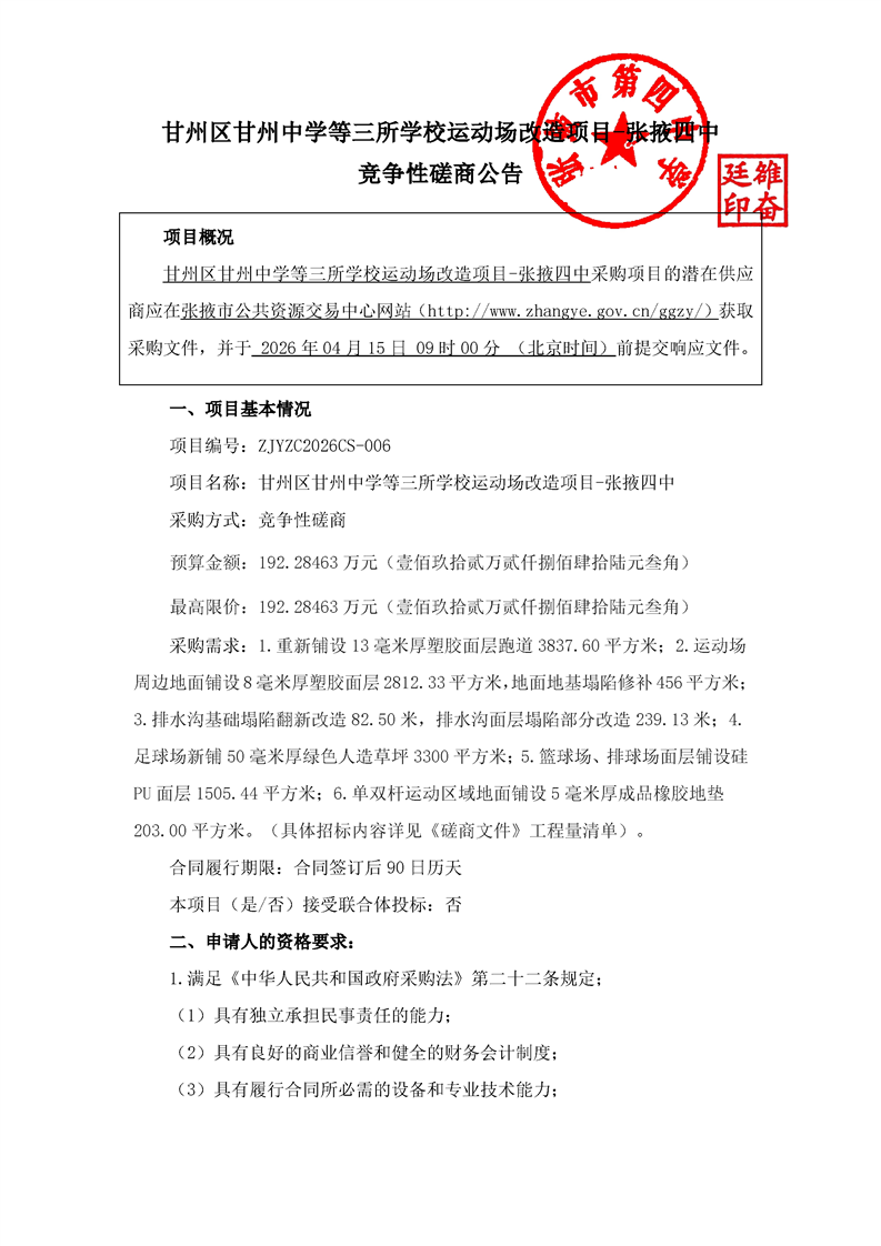 甘州区甘州中学等三所学校运动场改造项目-张掖四中竞争性磋商公告[采购/资审公告]