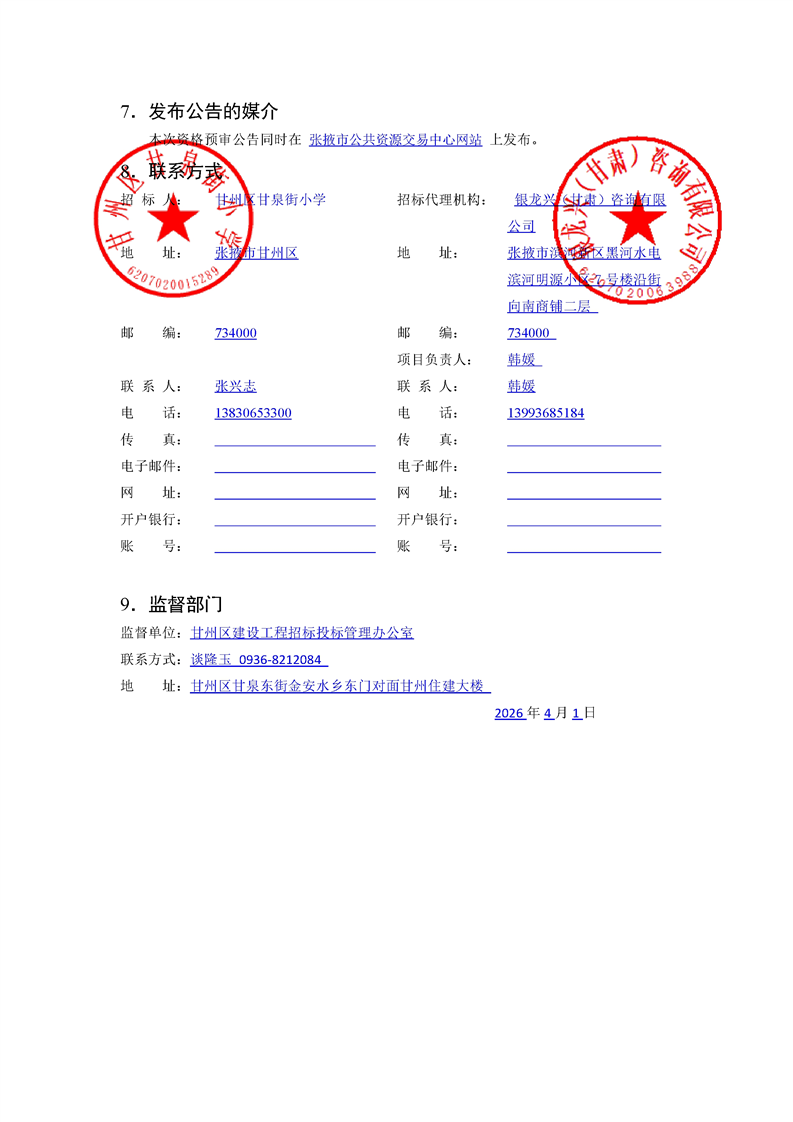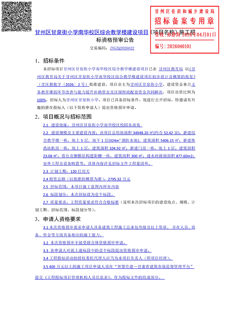 甘州区甘泉街小学南华校区综合教学楼建设项目[招标/资审公告]