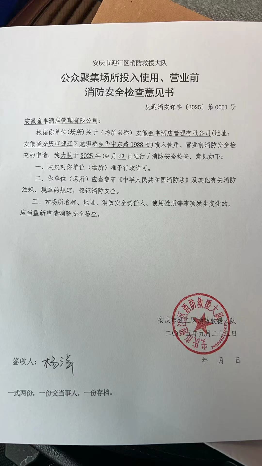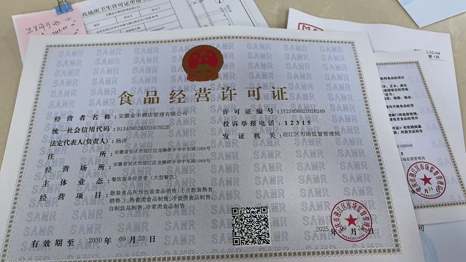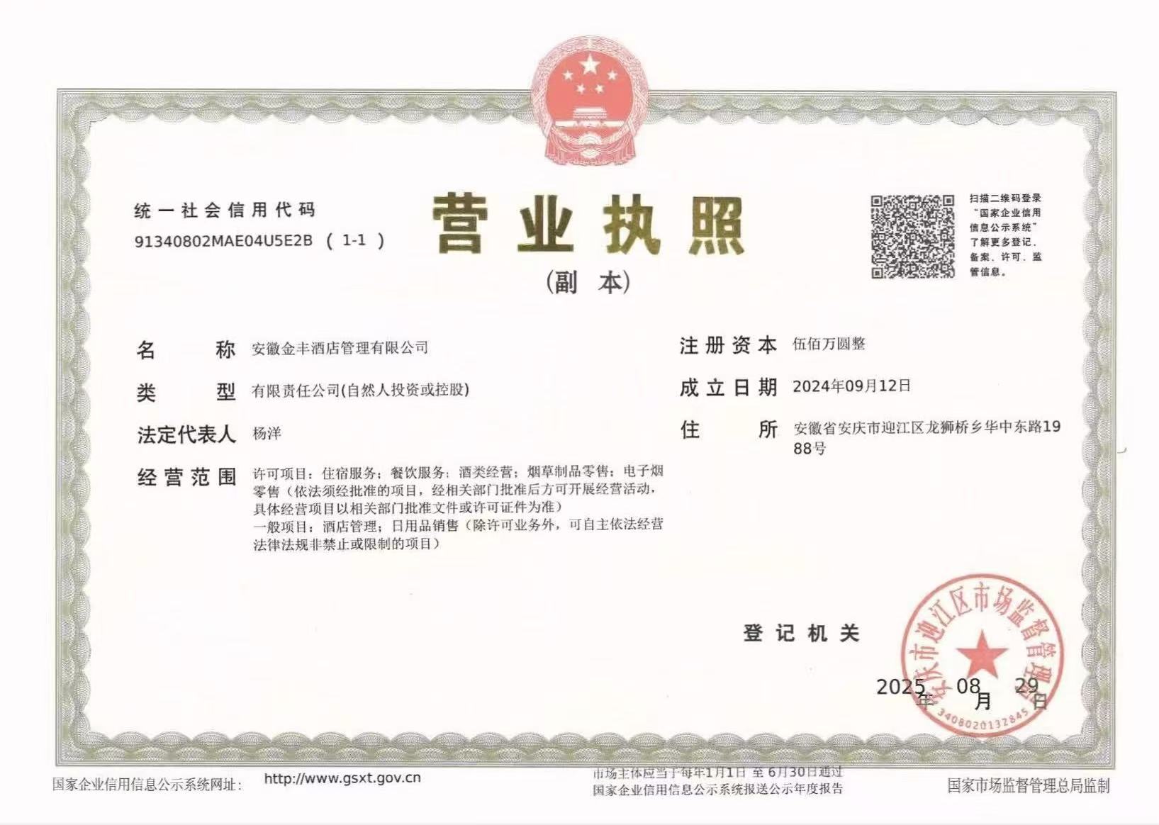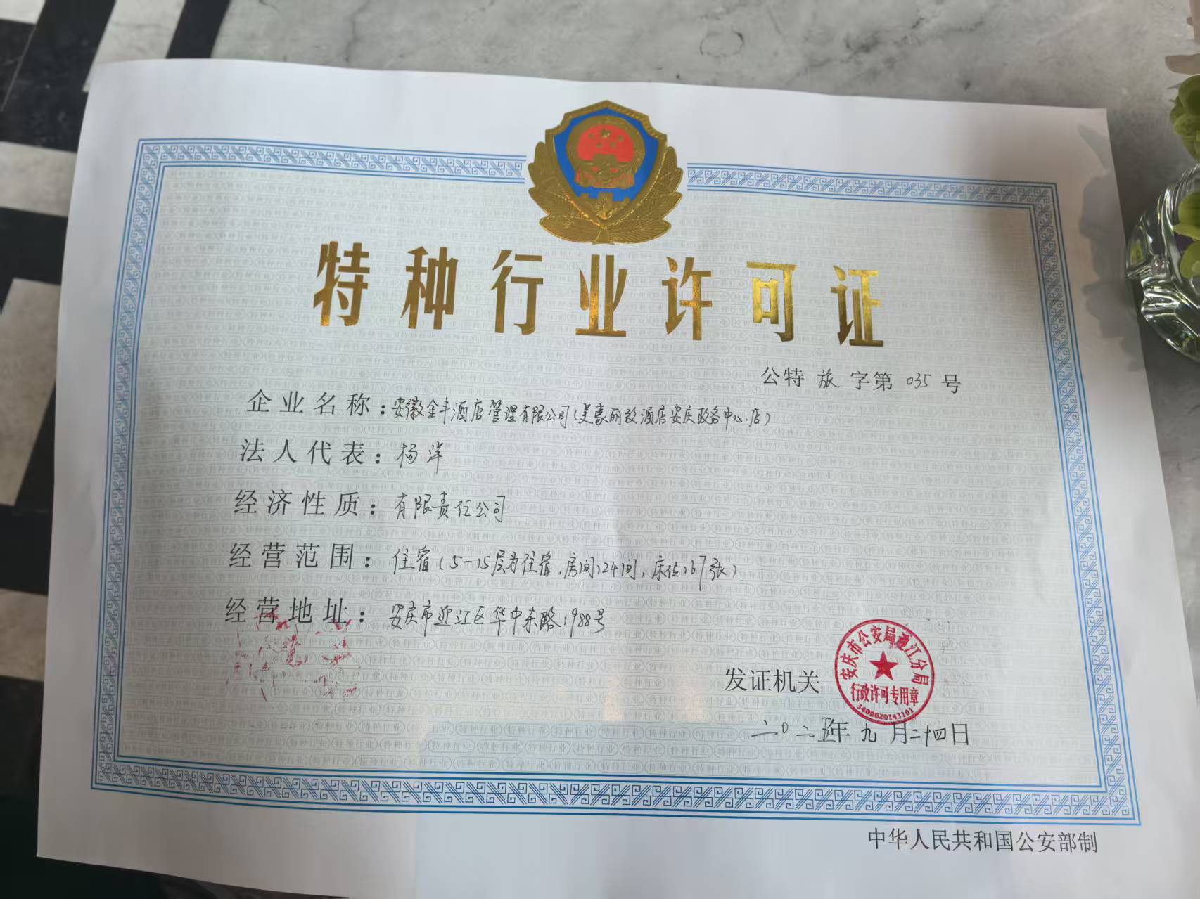 营业场所:安庆美豪丽致酒店