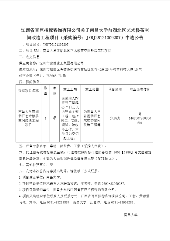 江西省百巨招标咨询有限公司关于南昌大学前湖北区艺术楼茶空间改造工程项目(采购编号:JXBJ26121309207)中选公告