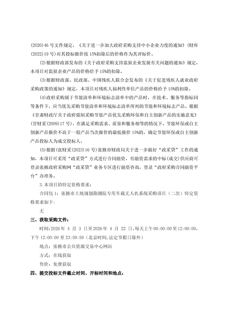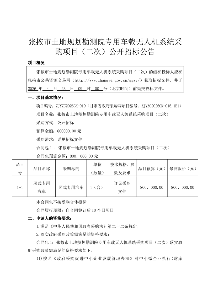 张掖市土地规划勘测院专用车载无人机系统采购项目(二次)公开招标公告[采购/资审公告]