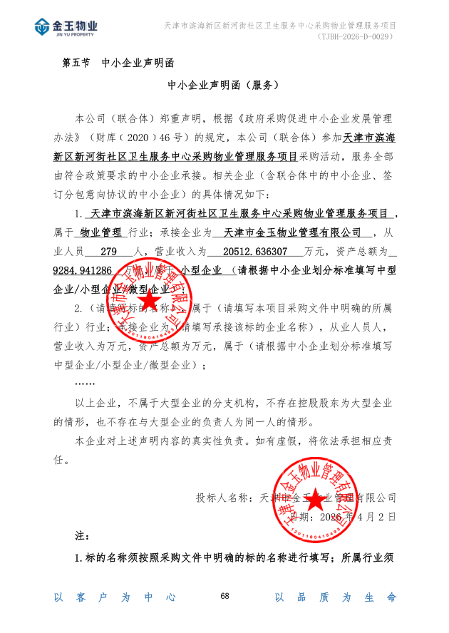 受天津市滨海新区新河街社区卫生服务中心委托,天津市滨海新区政府采购中心以公开招标方式,对天津市滨海新区新河街社区卫生服务中心采购物业管理服务项目实施采购,现将中标结果公布如下: 一、项目名称和编号 *.项目名称:天津市滨海新区新河街社区卫生服务中心采购物业管理服务项目 *.项目编号:**************** 二、中标信息 *.中标供应商名称:天津市金玉物业管理有限公司 *.中标供应商地址:天津市滨海新区滨海天津生态城中泰大道****号图书档案馆一层***** *.供应商评审报价、评审总得分及排序情况:见附件 *.主要中标标的名称、规格型号、数量、单价、服务要求或者标的基本概况:物业管理服务 三、评标委员会成员名单 高荣霞、周丽娅、张会刚、刘艳华、庄新华(采购人代表) 四、项目联系人及联系方式 *.联系人:肖琳 *.联系方式:************ 五、采购人的名称、地址和联系方式 *.采购人名称:天津市滨海新区新河街社区卫生服务中心 *.采购人地址:天津市滨海新区塘沽河南路*号 *.采购人联系电话:赵越,************ 六、采购代理机构的名称、地址和联系方式 *.采购代理机构名称:天津市滨海新区政府采购中心 *.采购代理机构地址:天津市滨海新区营口道***号 *.采购代理机构联系方式:************ 七、质疑方式 参与本项目政府采购活动的供应商认为中标结果使自己的合法权益受到损害的,可以在中标结果公告期限届满之日起*个工作日内,以书面形式向采购人和天津市滨海新区政府采购中心提出质疑,逾期不予受理。 八、本项目不向中标供应商收取服务费。 九、中标结果公告期限 中标结果的公告期限为*个工作日。 十、招标文件公告:见附件