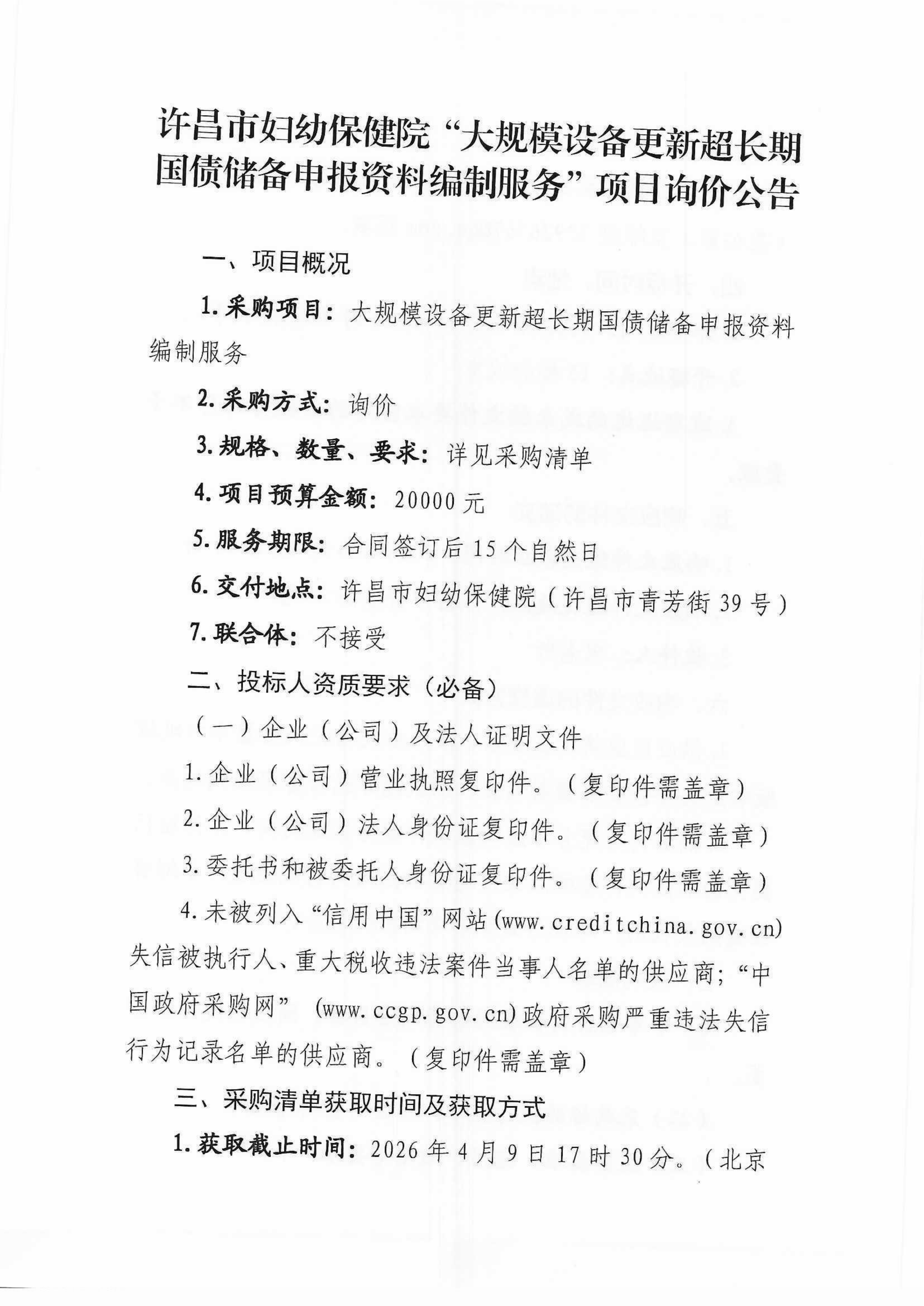 许昌市妇幼保健院“大规模设备更新超长期国债储备申报资料编制服务”项目询价公告