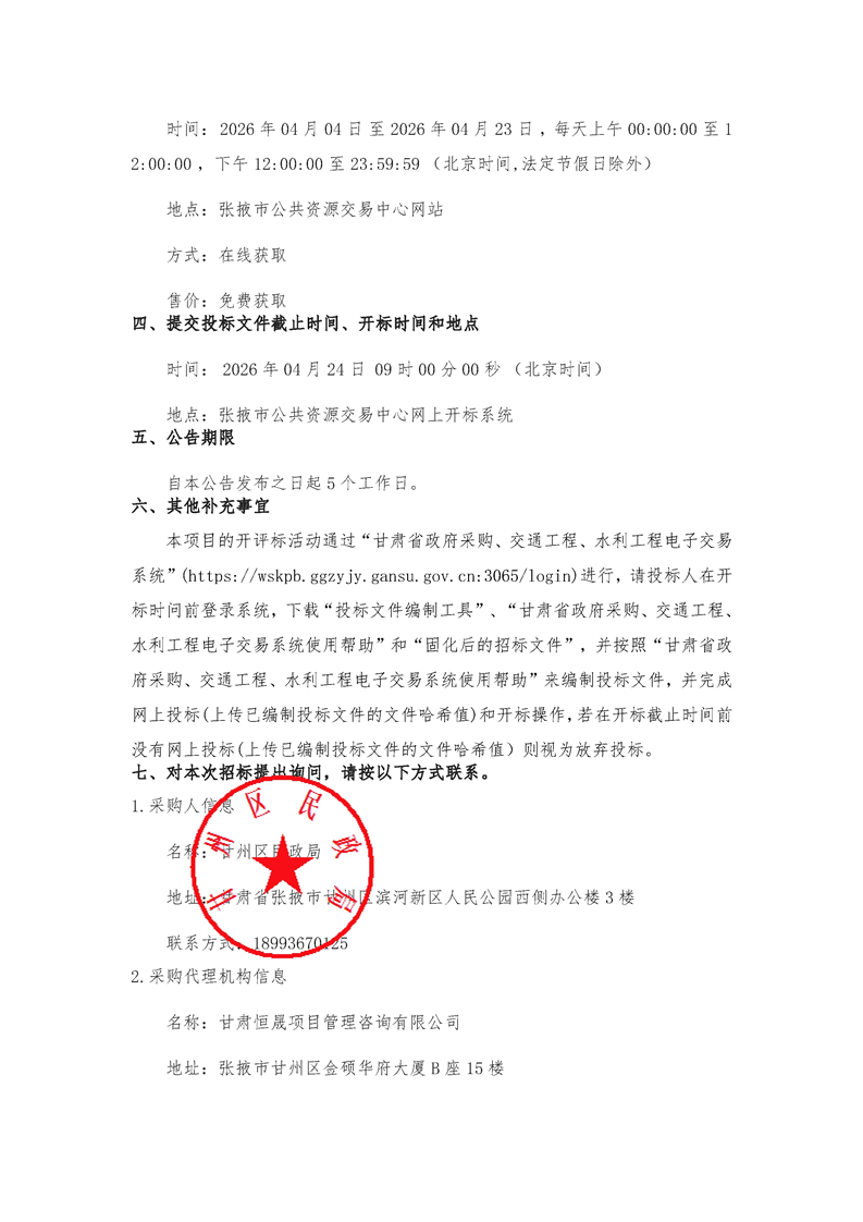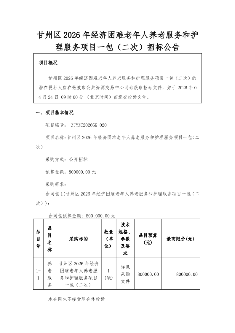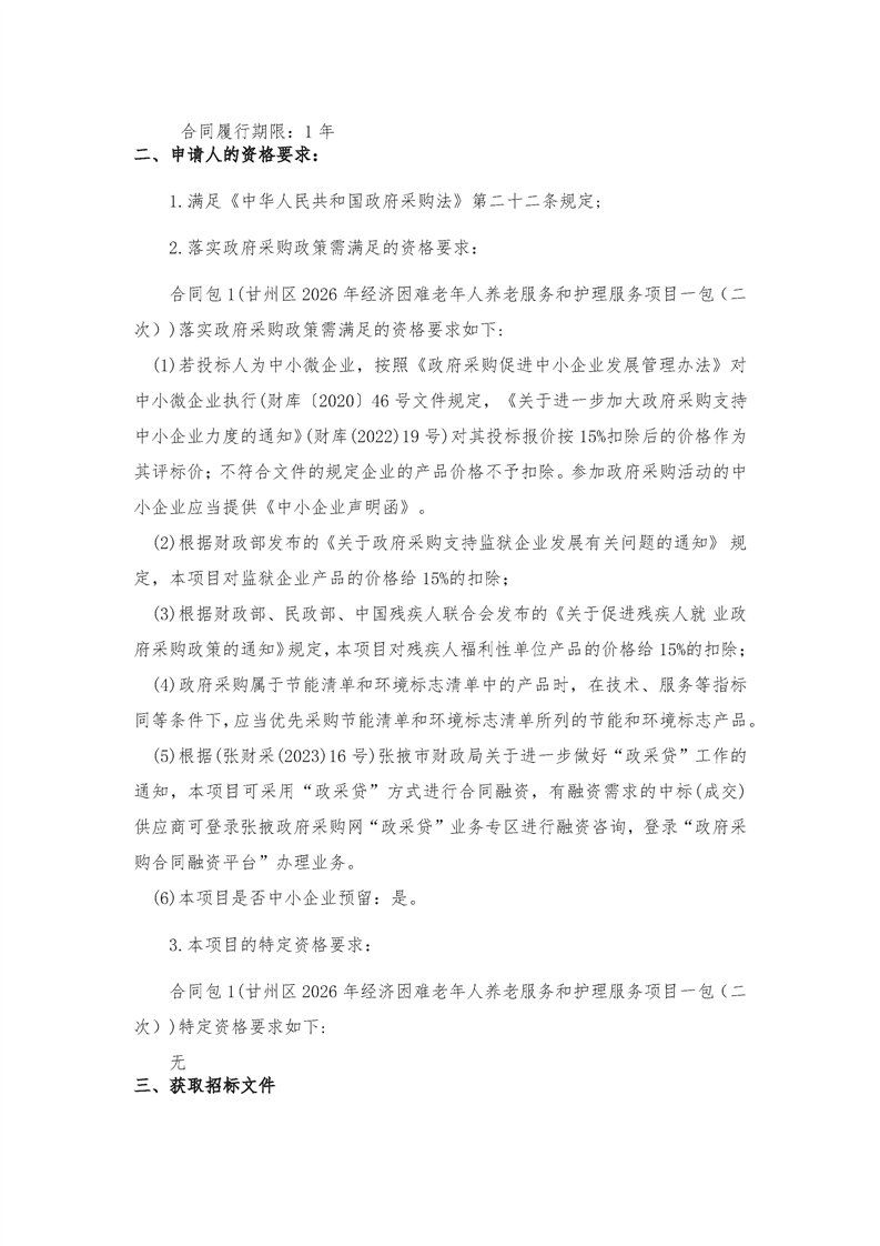 甘州区2026年经济困难老年人养老服务和护理服务项目一包(二次)招标公告[采购/资审公告]