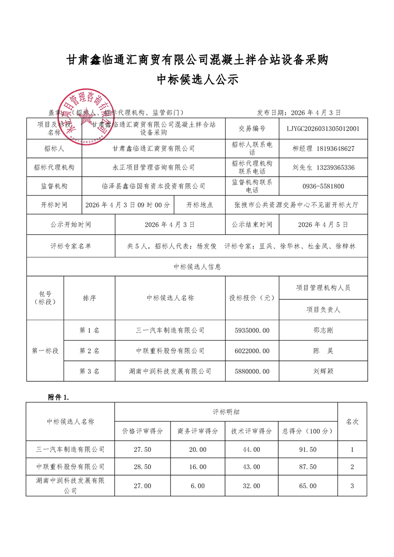 [临泽县]甘肃鑫临通汇商贸有限公司混凝土拌合站设备采购中标候选人公示[交易结果公示]