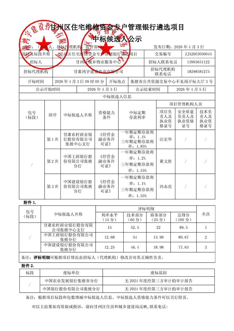 [市本级]甘州区住宅维修资金专户管理银行遴选项目中标候选人公示[交易结果公示]