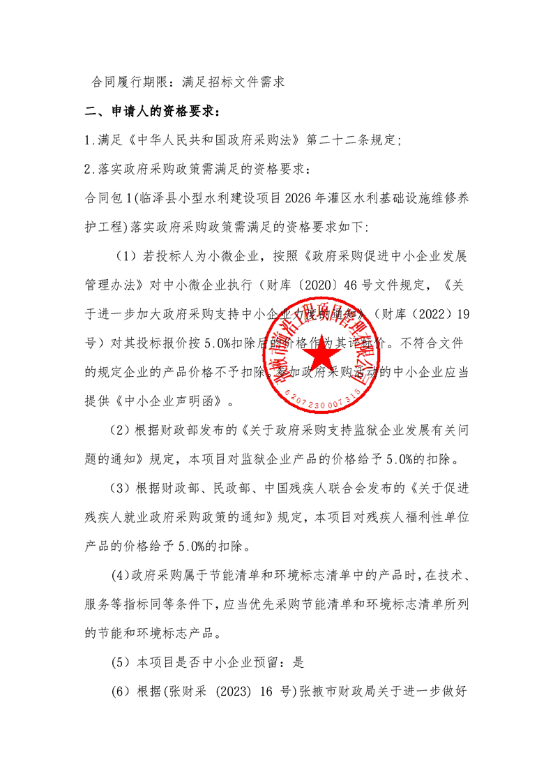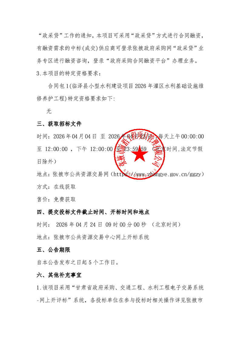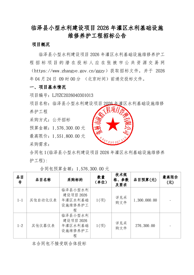临泽县小型水利建设项目2026年灌区水利基础设施维修养护工程招标公告{type}