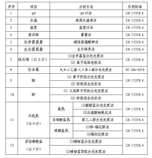 ①海水养殖检测项目包括悬浮物、**、化学需氧量、生化需氧量、锌、铜、无机氮、活性磷酸盐、硫化物、总余氯、水温、盐度等**个项目指标。