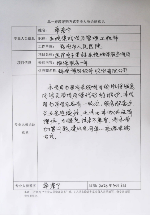 *、采用单一来源采购方式的原因及说明:医院医疗电子票据系统对接财政端电子票据平台,系统接口规范、数据加密规则及业务逻辑均由原维保供应商建设维护,具有技术专业性、平台唯一性及数据安全性要求,为保证系统服务稳定安全运行,满足数据上报要求,实施单一来源采购。