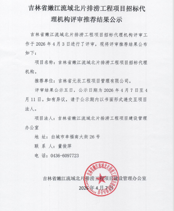 吉林省嫩江流域北片排涝工程项目招标代理机构评审推荐结果公示