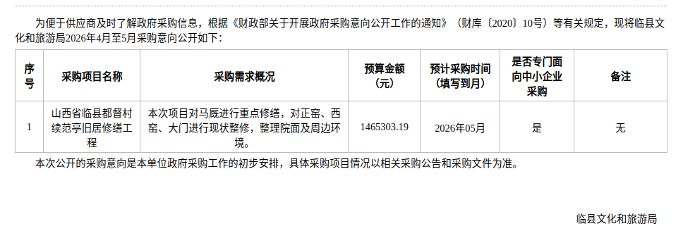 临县文化和旅游局2026年4月至5月政府采购意向