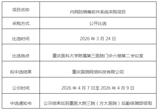 重医大附三院(方大医院)内网防病毒软件系统采购项目中选结果公示