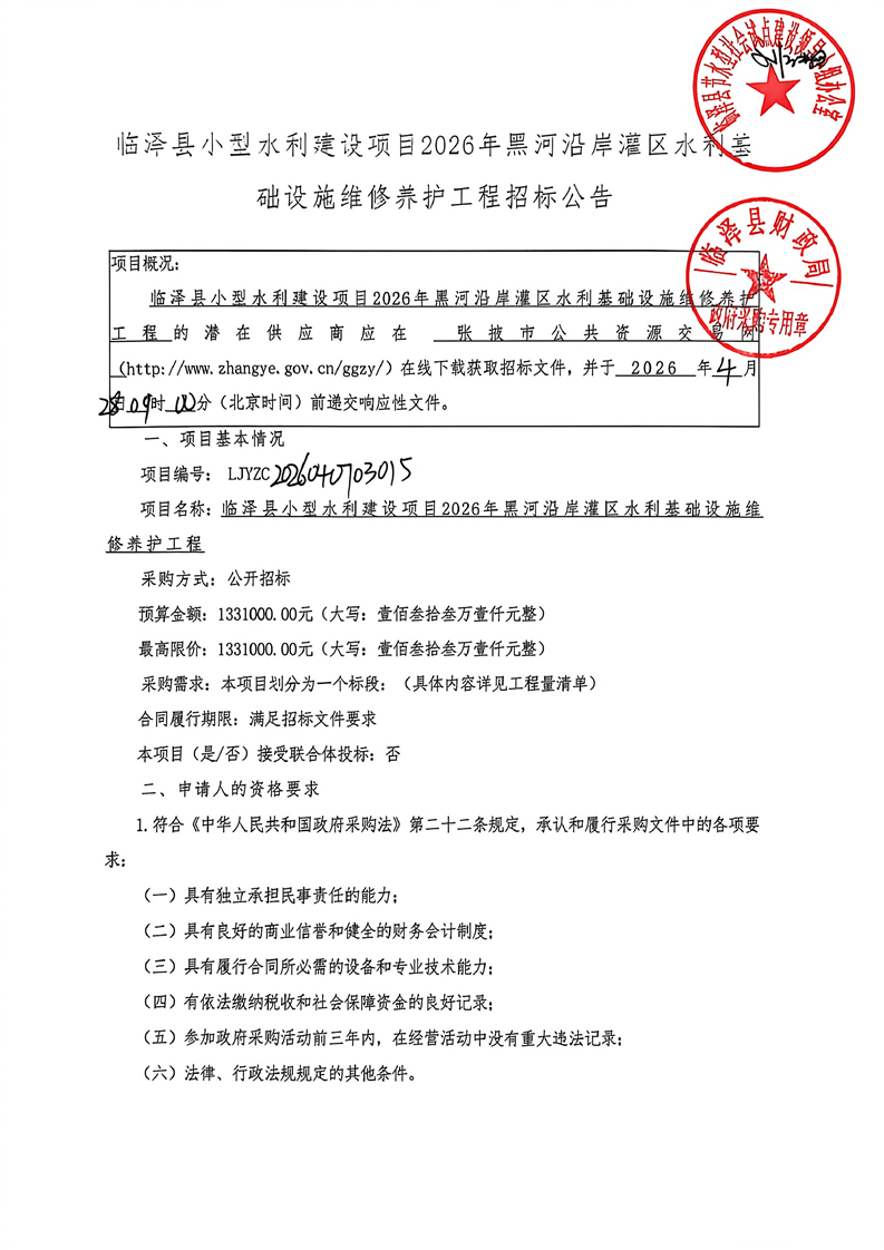 临泽县小型水利建设项目2026年黑河沿岸灌区水利基础设施维修养护工程招标公告{type}