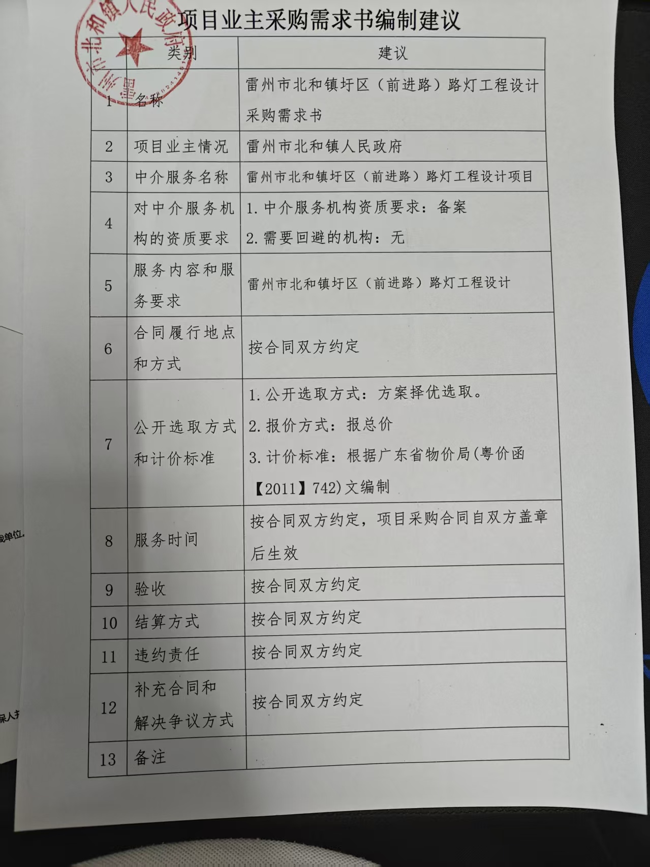 雷州市北和镇圩区(前进路)路灯工程设计项目采购公告