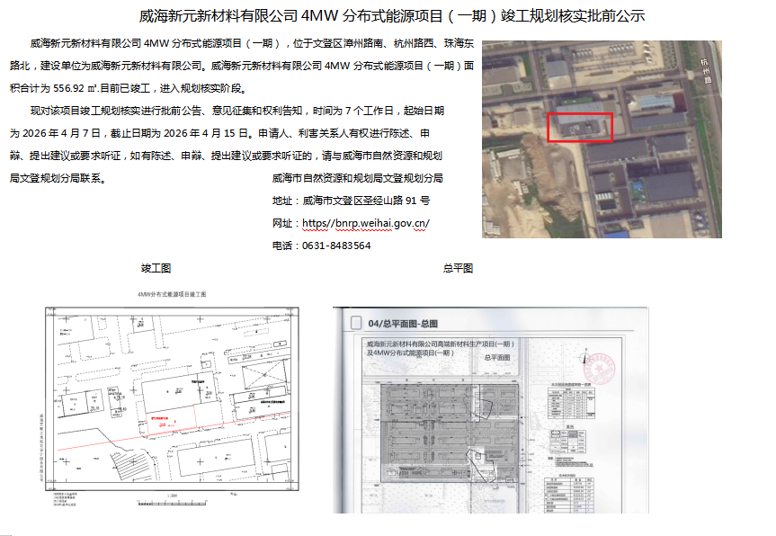 威海新元新材料有限公司4MW分布式能源项目(一期)竣工规划核实批前公...