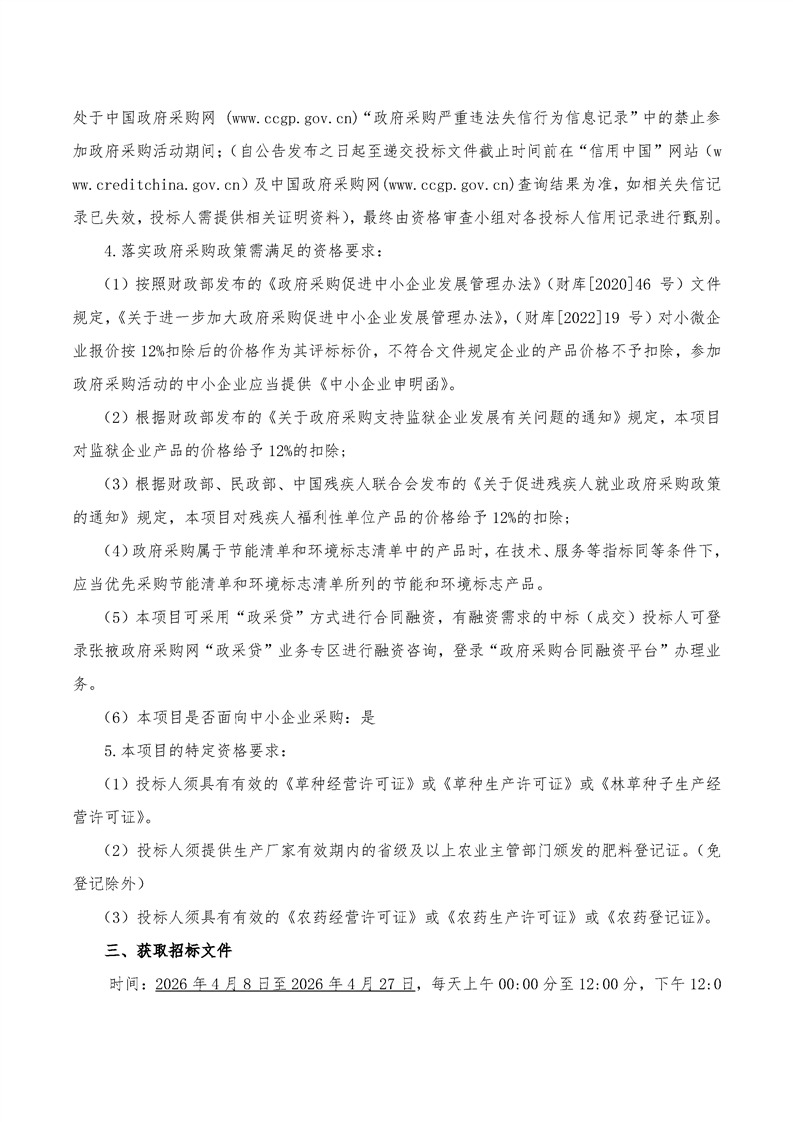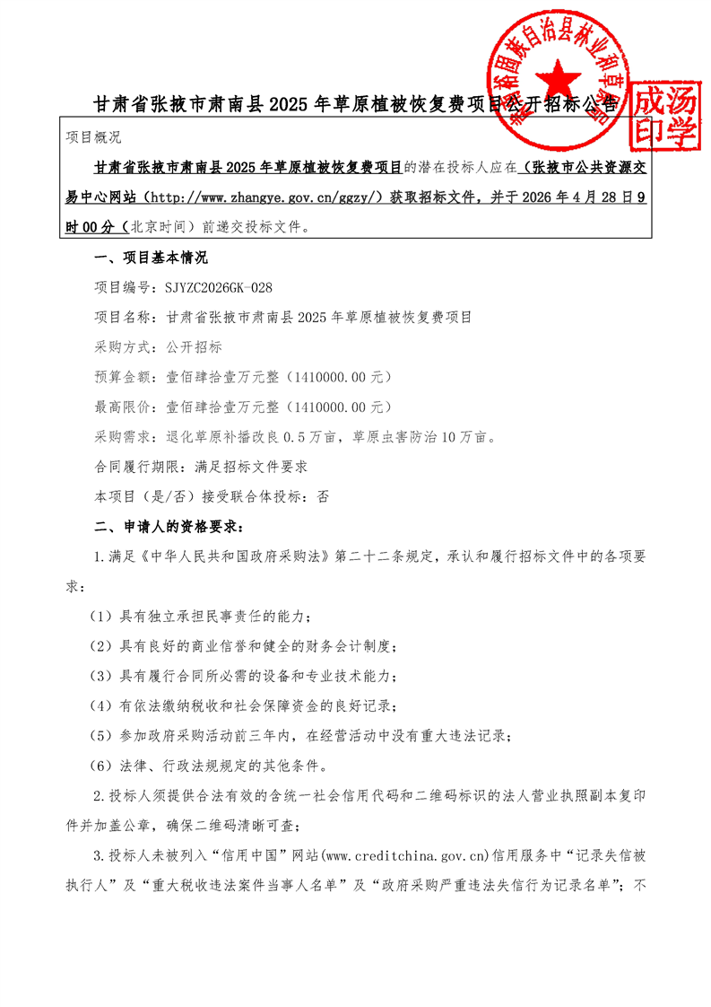 甘肃省张掖市肃南县2025年草原植被恢复费项目招标公告[采购/资审公告]