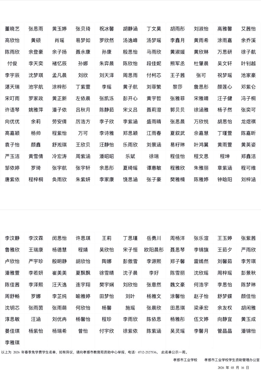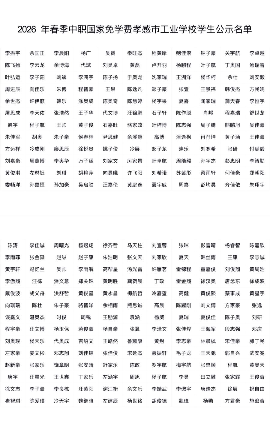 2026年春季中职国家免学费孝感市工业学校学生公示名单