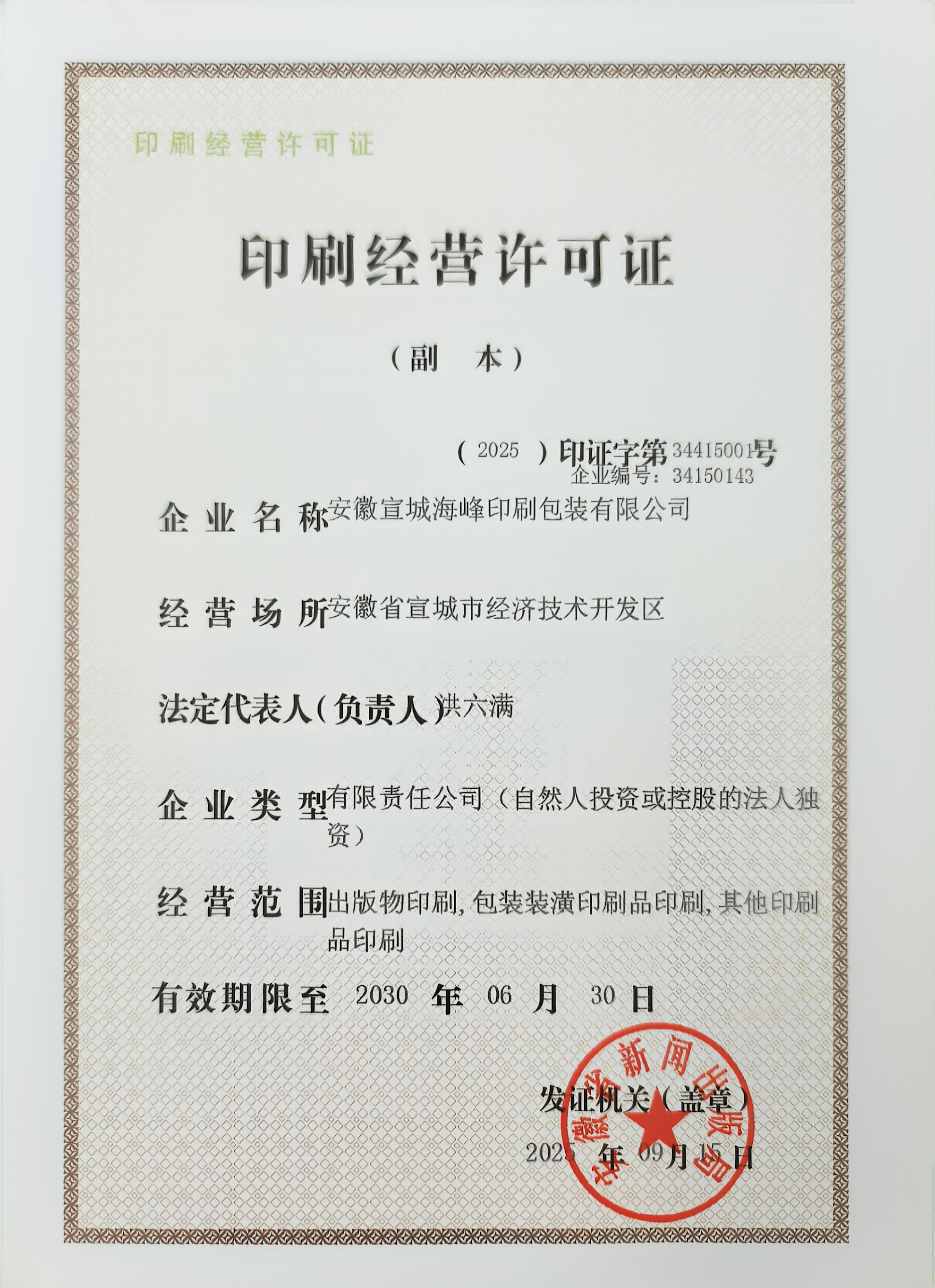 安徽宣城海峰印刷包装有限公司印刷服务(《印刷业管理条例》出版物
