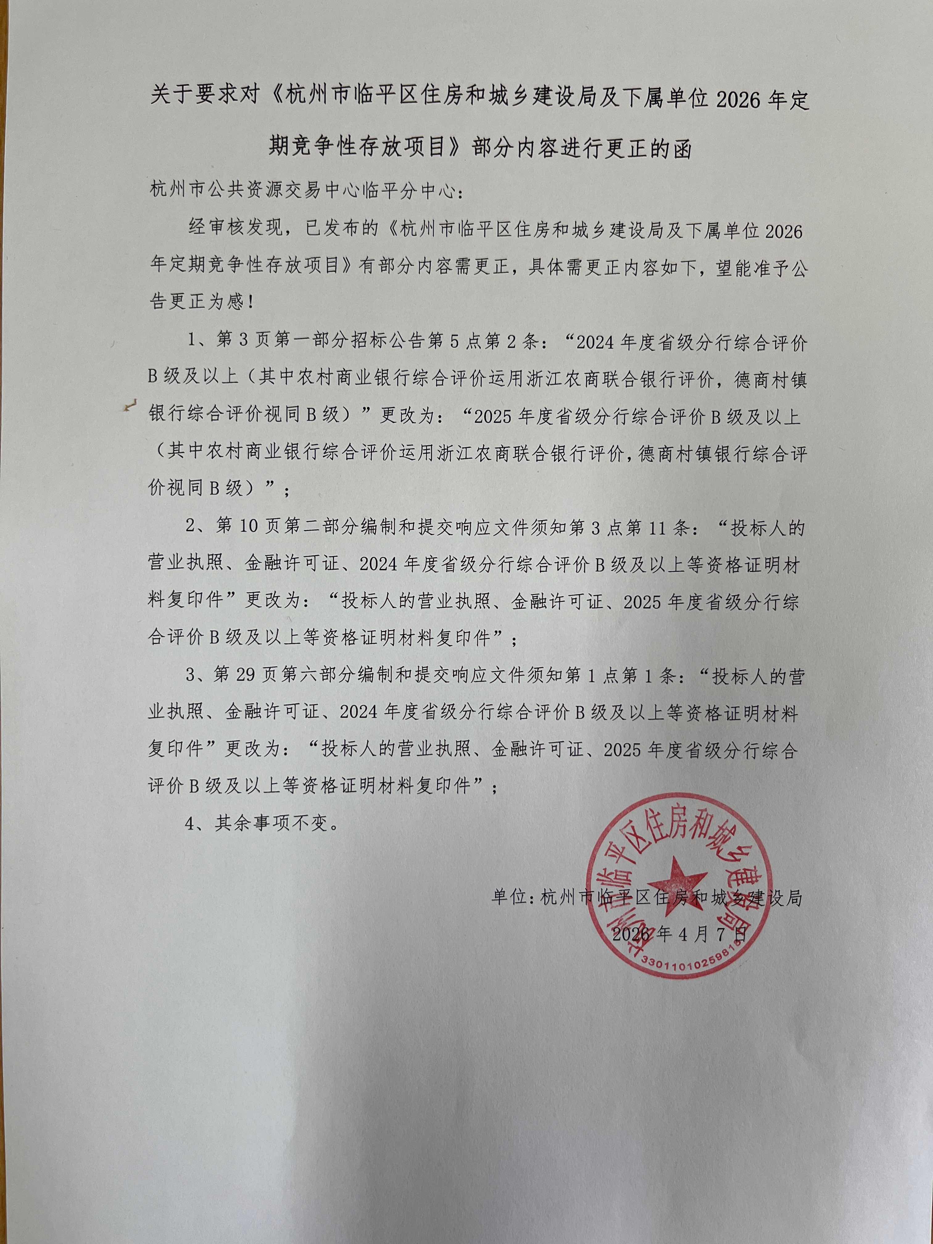 关于杭州市临平区住房和城乡建设局及下属单位2026年定期竞争性存放项目的更正公告[杭州市公共资源交易中心临平分中心(杭州市临平区政府采购中心)]