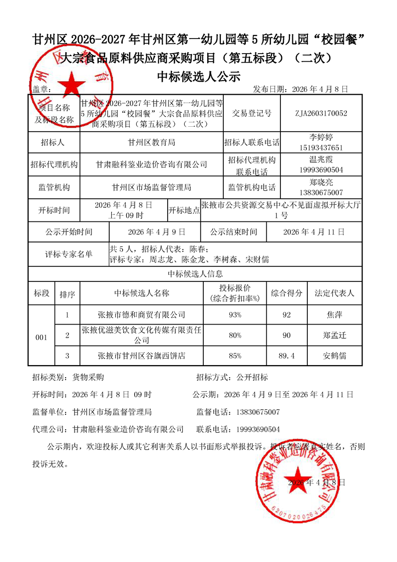 [市本级]甘州区2026-2027年甘州区第一幼儿园等5所幼儿园“校园餐”大宗食品原料供应商采购项目(第五标段)(二次)中标候选人公示[交易结果公示]