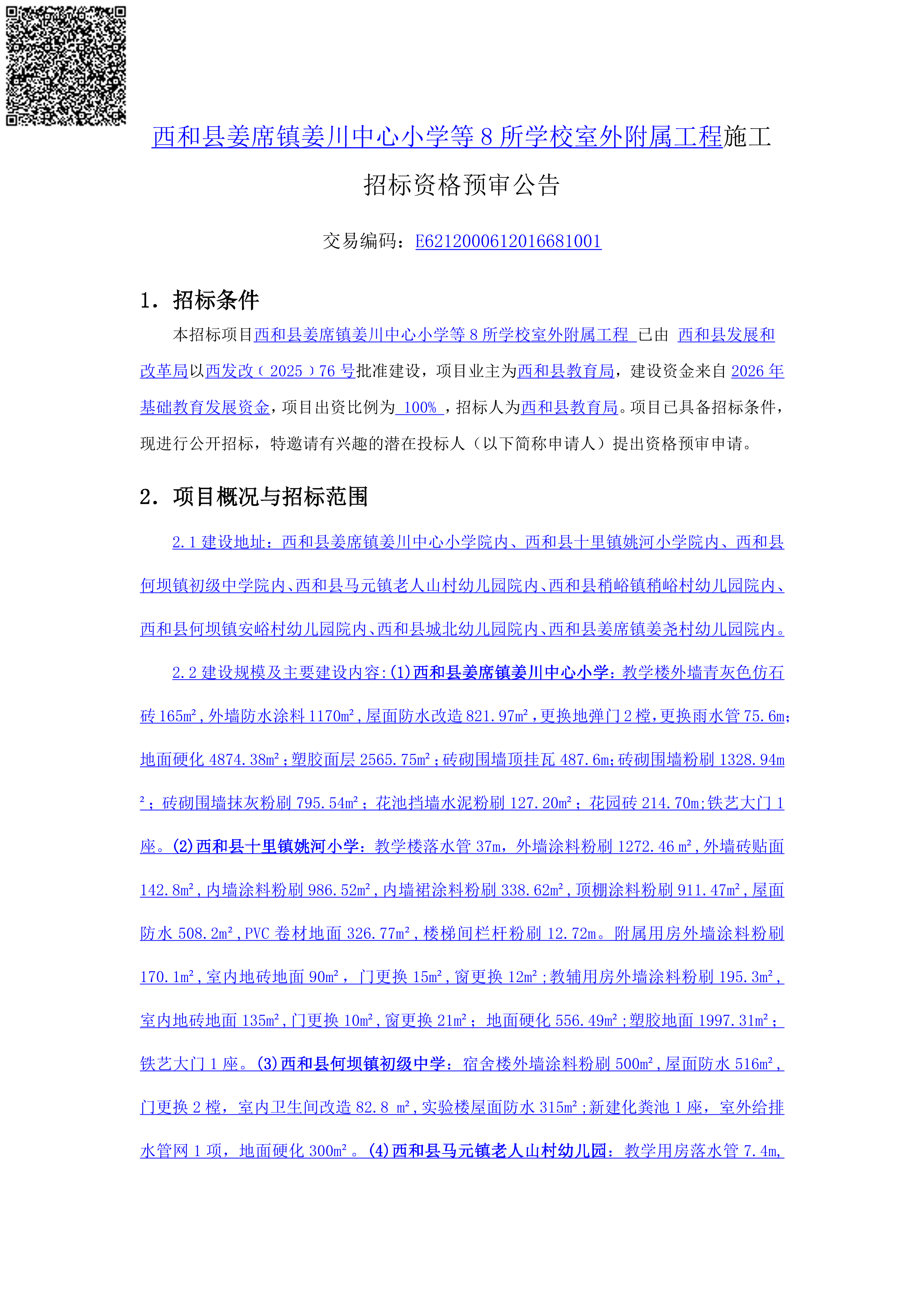 西和县姜席镇姜川中心小学等8所学校室外附属工程施工招标资格预审公告[招标/资审公告]