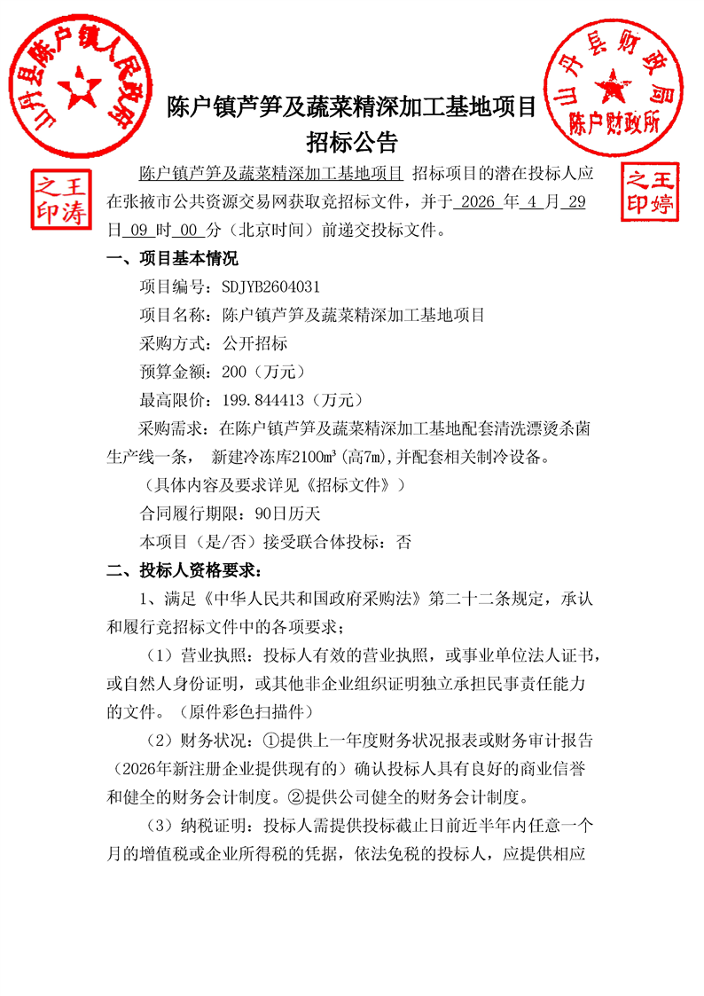 【正常公告】陈户镇芦笋及蔬菜精深加工基地项目招标公告
