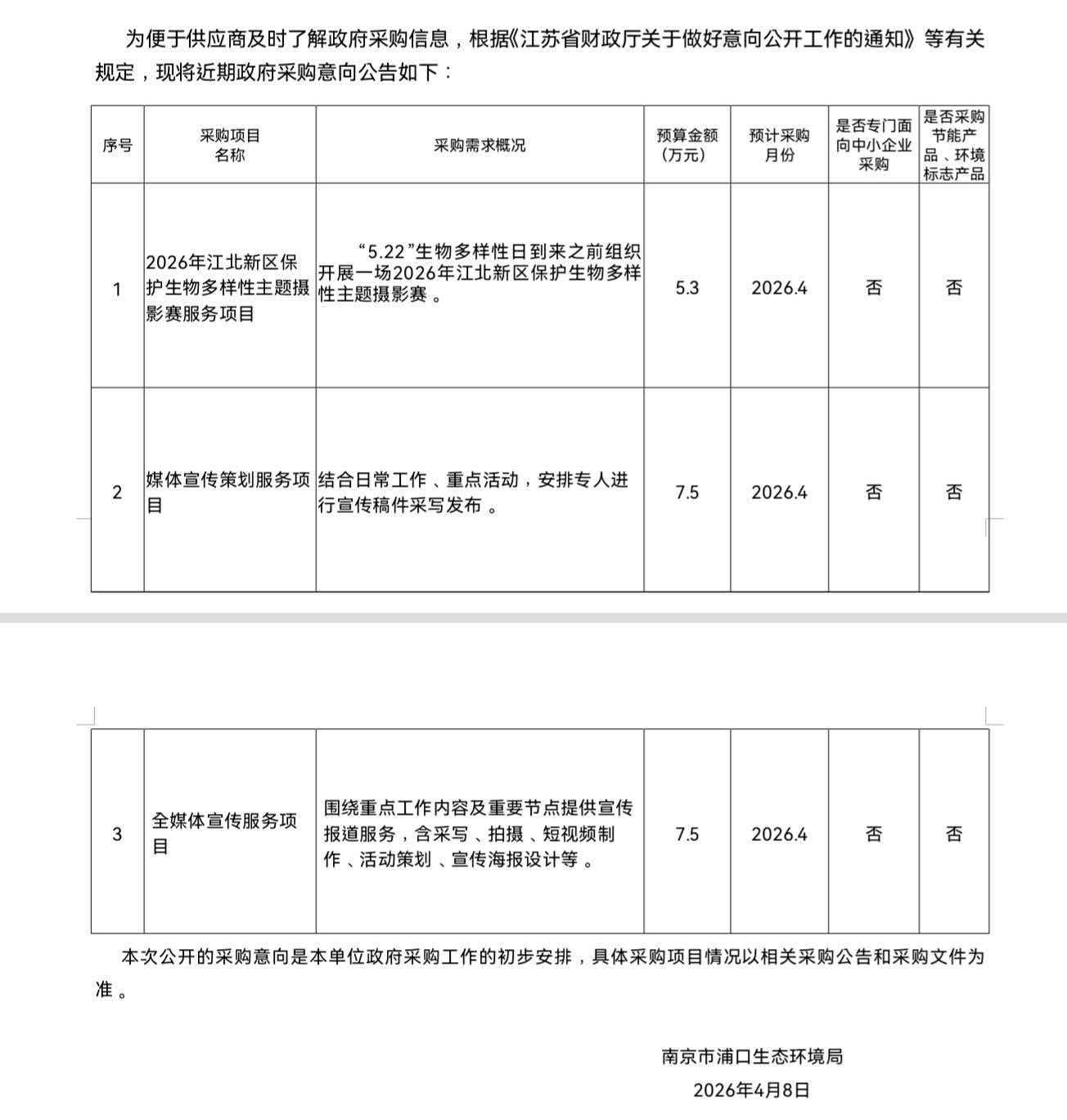 南京市浦口生态环境局2026年4月政府采购意向公告