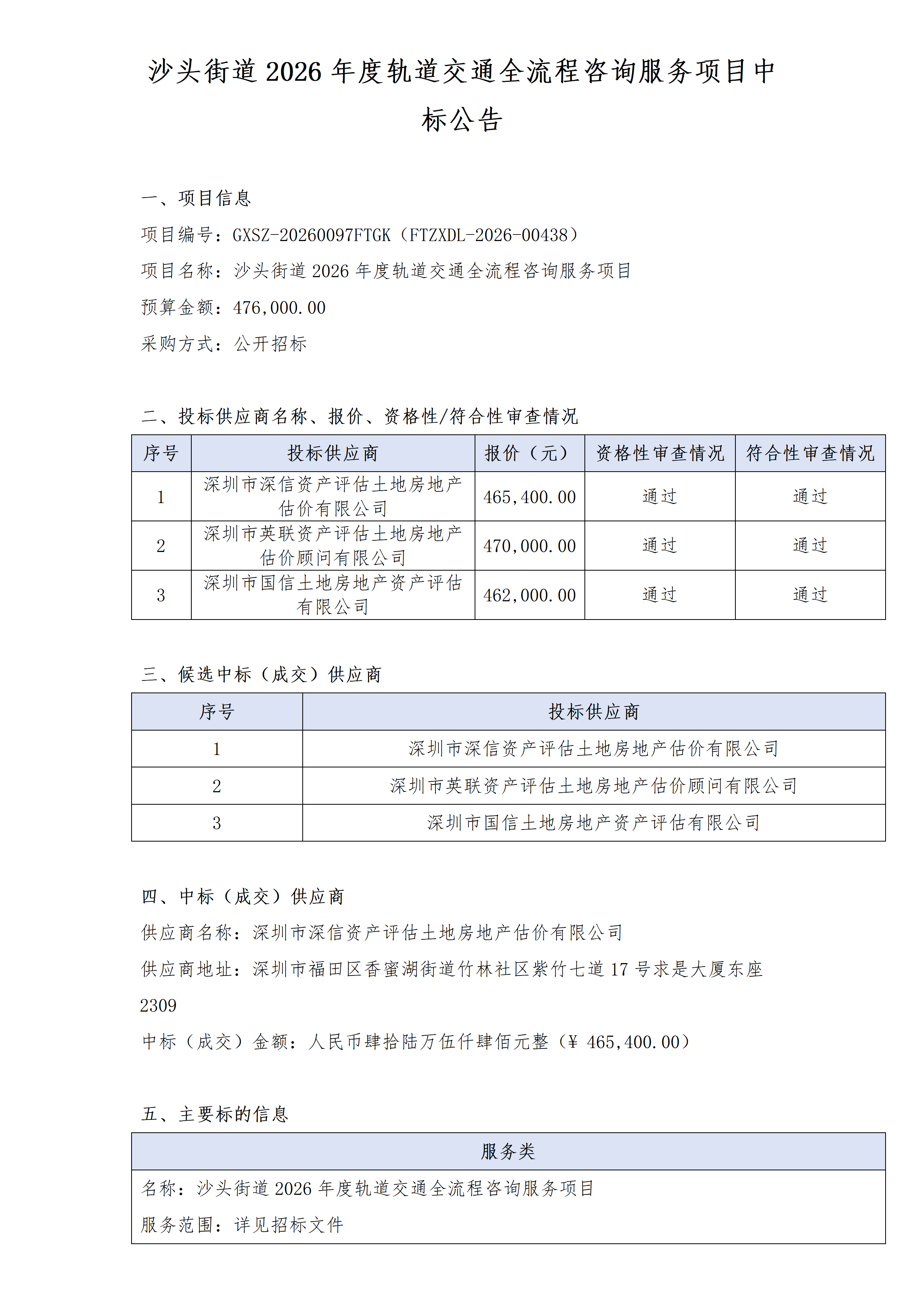 9沙头街道2026年度轨道交通全流程咨询服务项目的采购结果公告