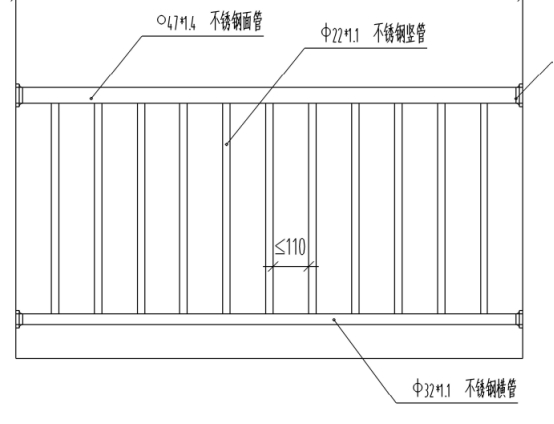 *.技术参数:高度*****。材料规格:面管:Φ******.***,立柱:Φ****.***,横管:Φ****.***,竖管:Φ****.***。竖管间距≤*****,立柱间距≤******,平均分配。
