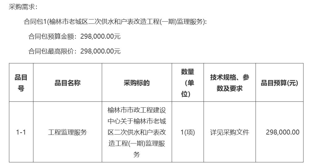 | *** | 工程监理服务 | 榆林市市政工程建设中心关于榆林市老城区二次供水和户表改造工程(一期)监理服务 | *(项) | 详见采购文件 | ***,***.** |