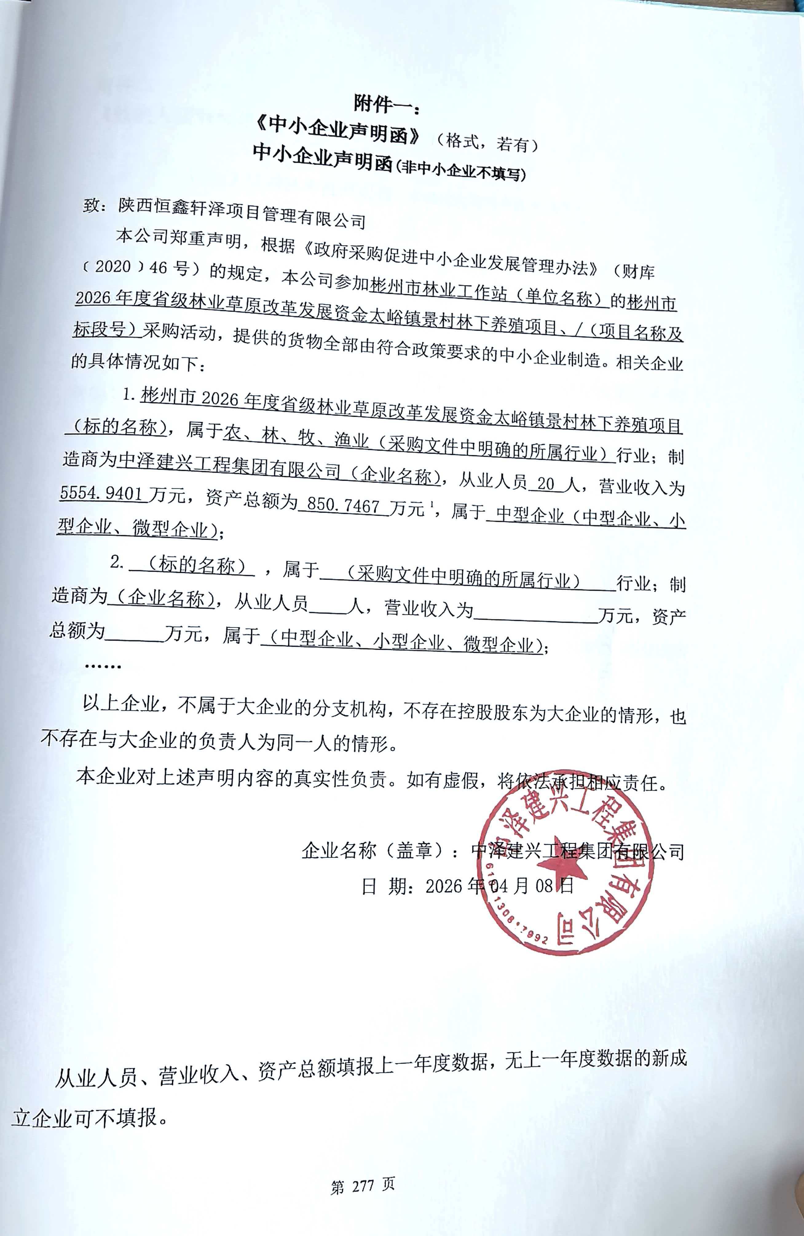 彬州市2026年度省级林业草原改革发展资金太峪镇景村林下养殖项目中标(成交)结果公告
