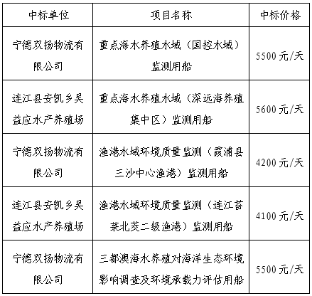 ****年度福建省渔业资源监测中心沿海重点渔业水域生态与资源监测外业调查船舶租赁服务公开比价中标公告