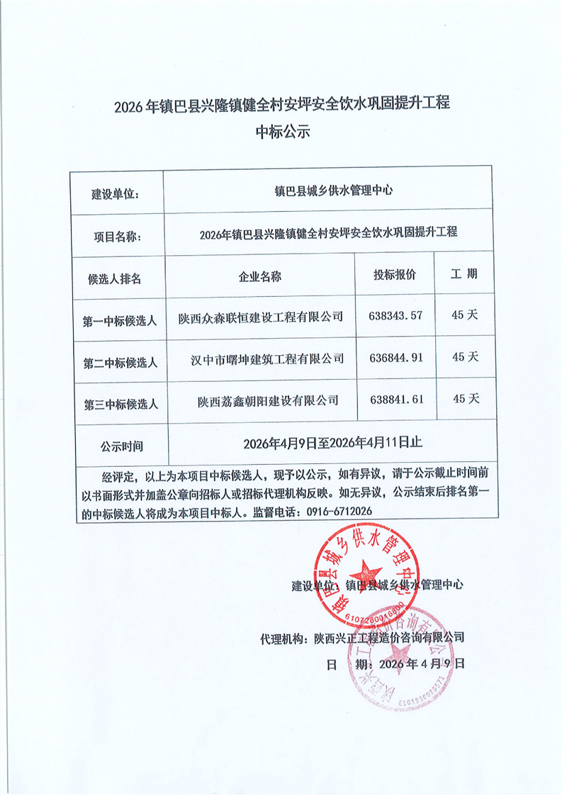 2026年镇巴县兴隆镇健全村安坪安全饮水巩固提升工程中标公示
