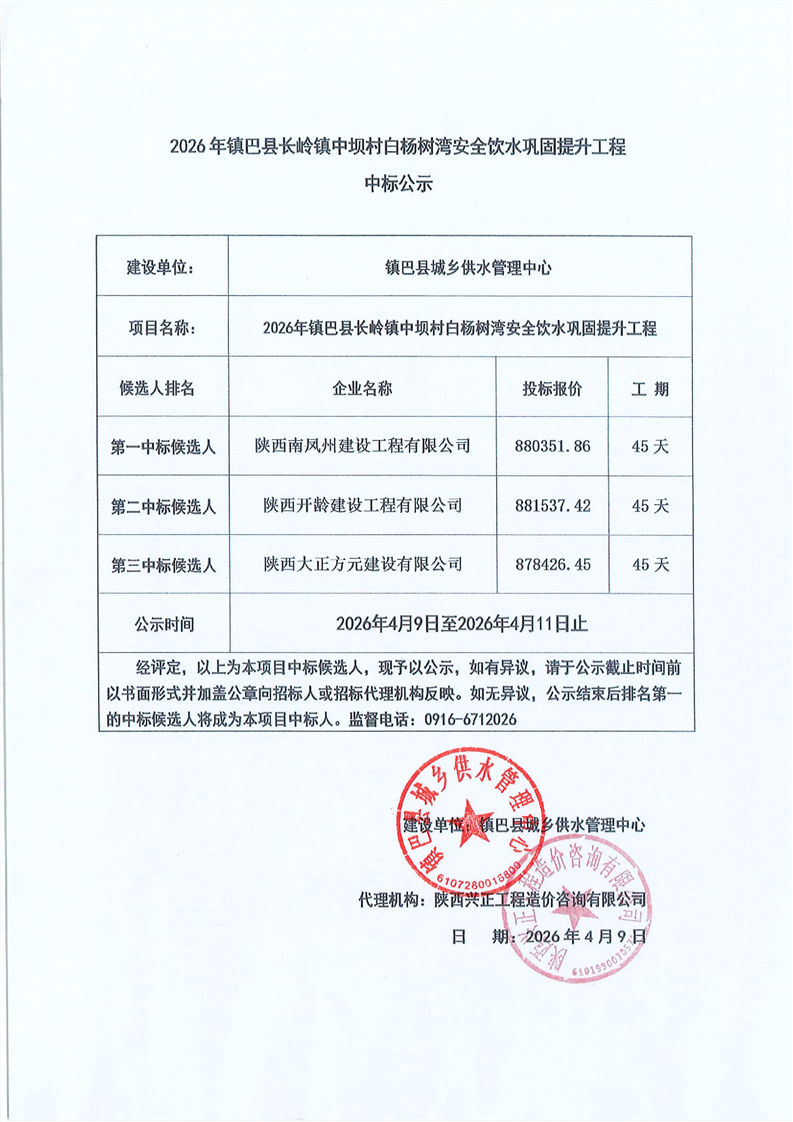 2026年镇巴县长岭镇中坝村白杨树湾安全饮水巩固提升工程中标公示