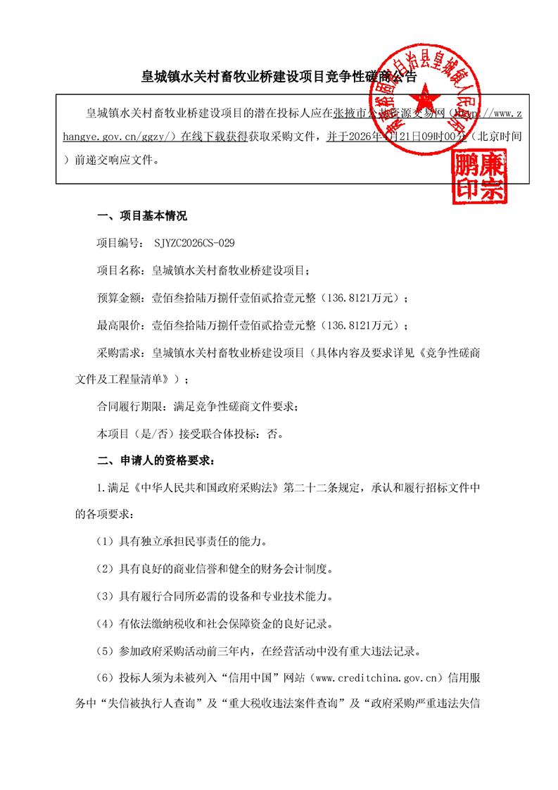 皇城镇水关村畜牧业桥建设项目竞争性磋商公告[采购/资审公告]
