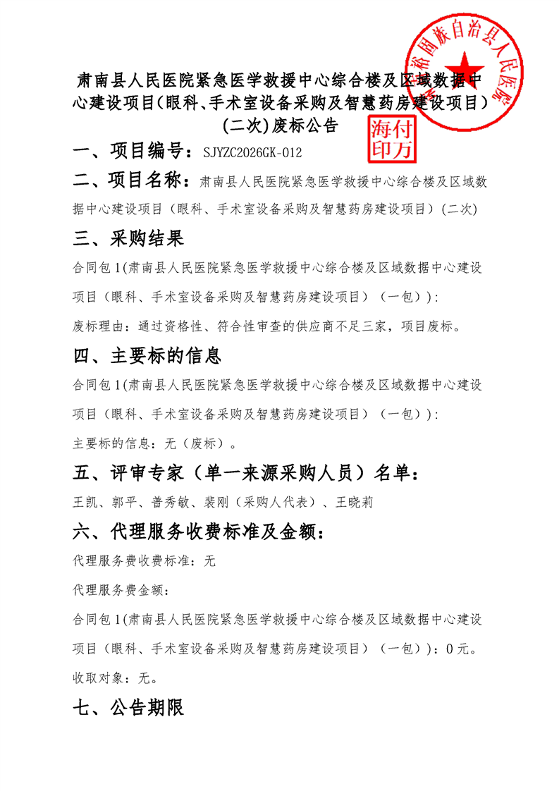 【废标公告】肃南县人民医院紧急医学救援中心综合楼及区域数据中心建设项目(眼科、手术室设备采购及智慧药房建设项目)(二次)废标公告
