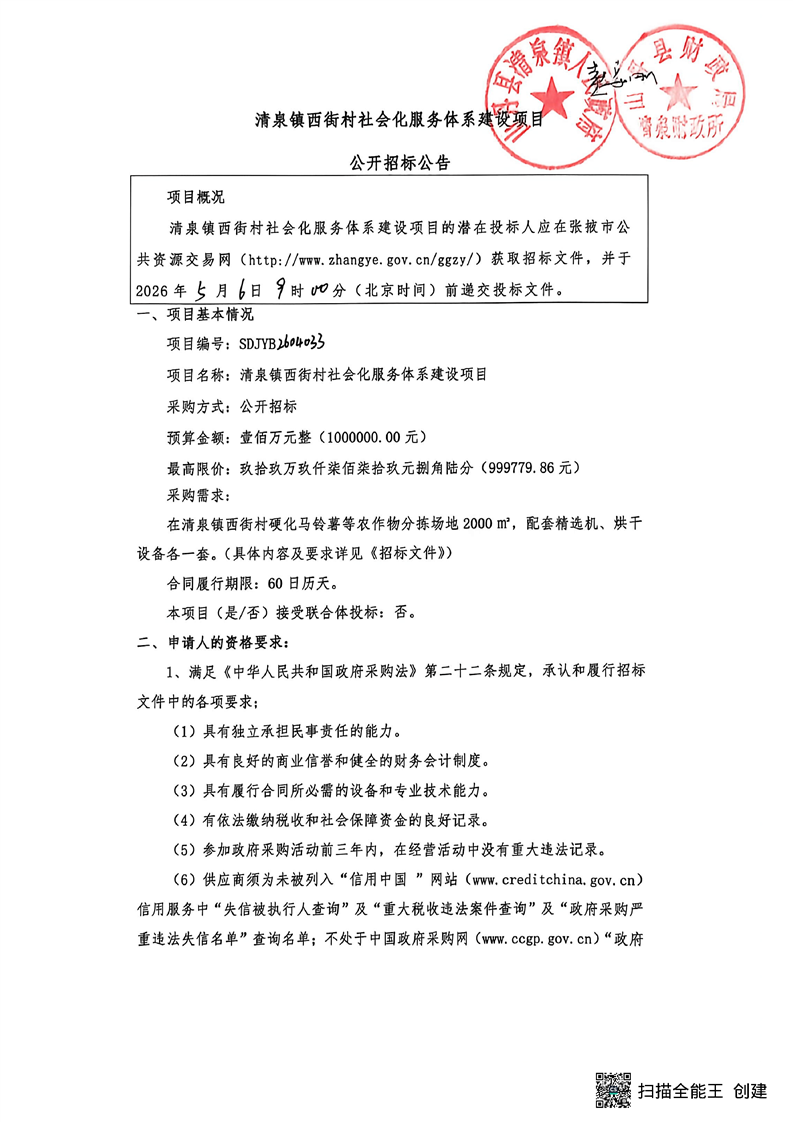 【正常公告】清泉镇西街村社会化服务体系建设项目招标公告