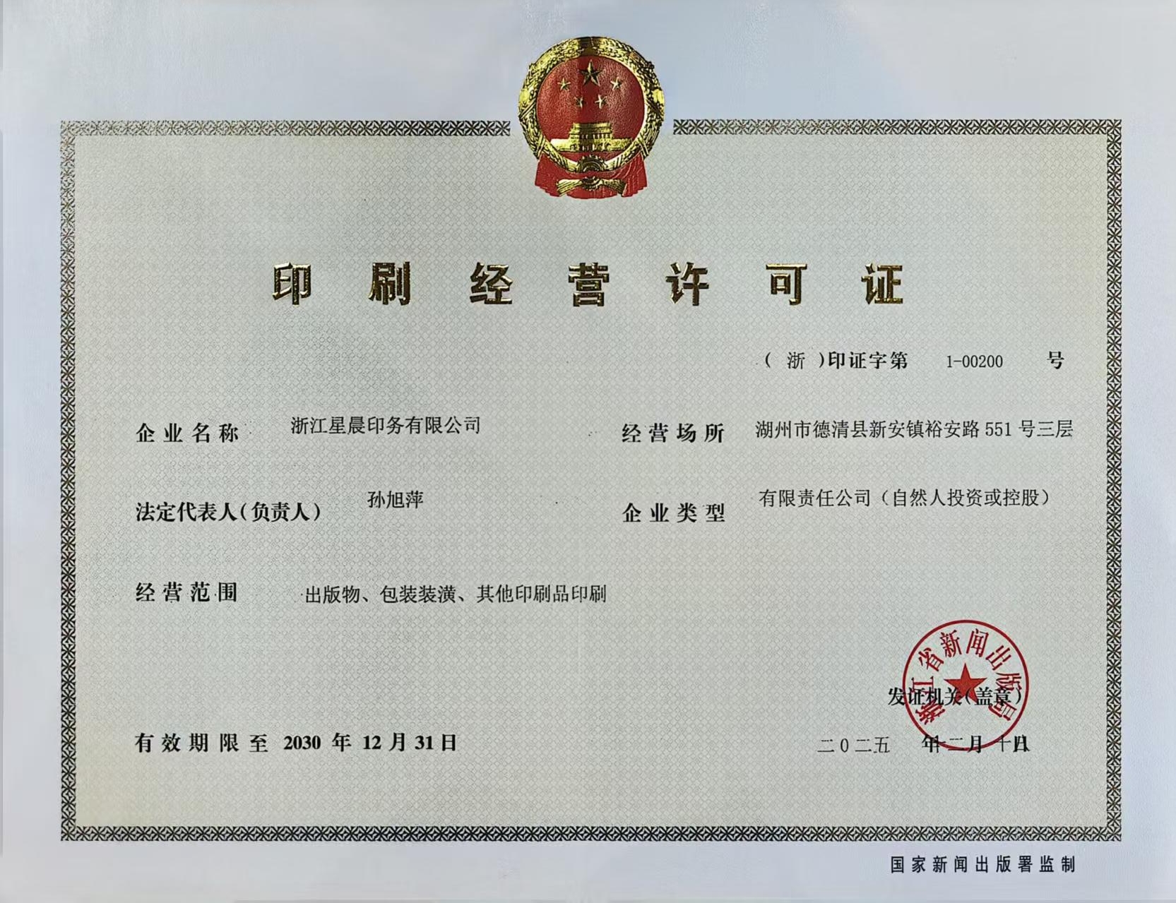 印刷经营许可证:星晨印刷许可证新正本.***