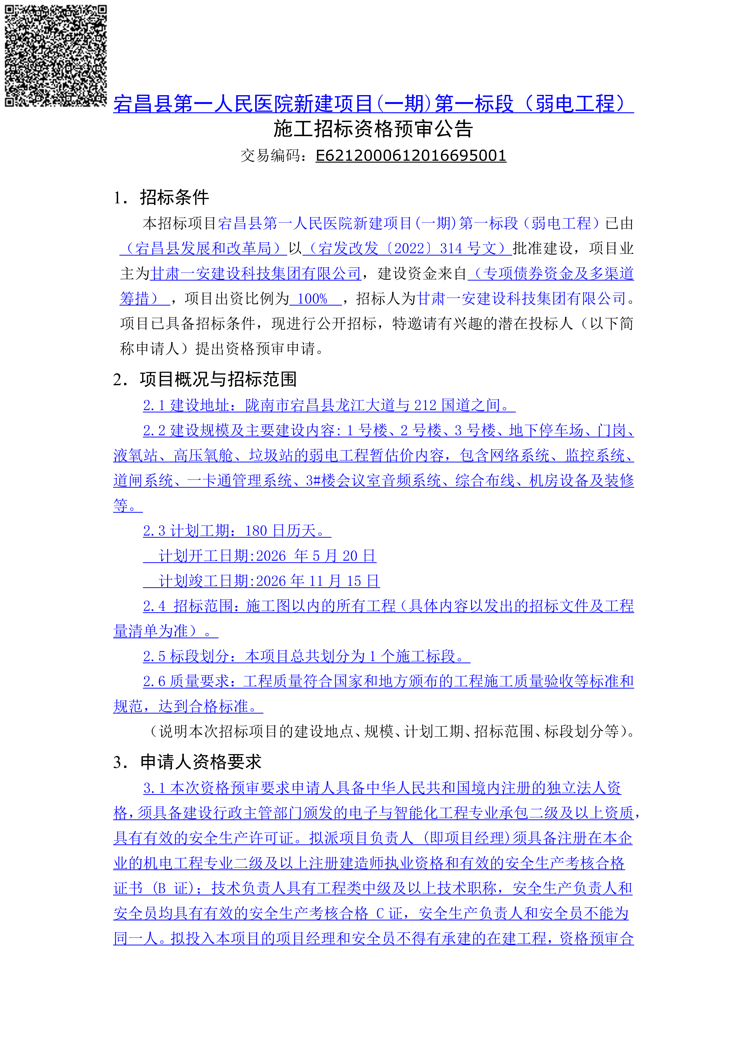 宕昌县第一人民医院新建项目(一期)第一标段(弱电工程)施工招标资格预审公告[招标/资审公告]