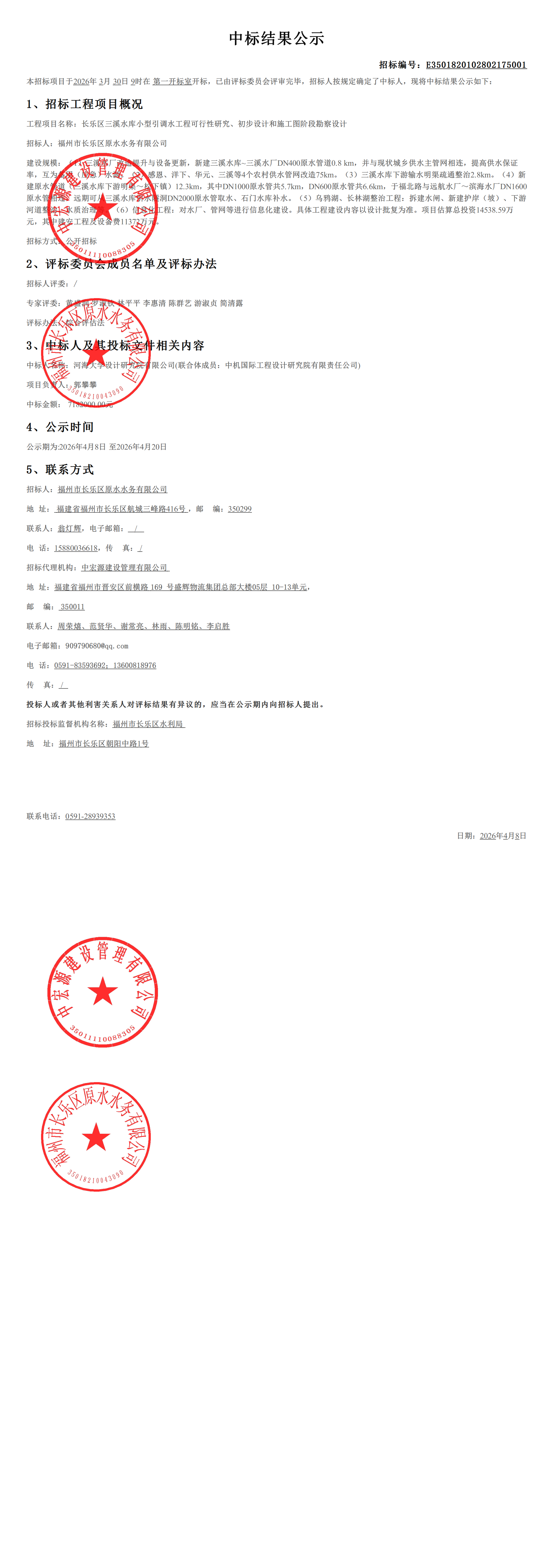 长乐区三溪水库小型引调水工程可行性研究、初步设计和施工图阶段勘察设计