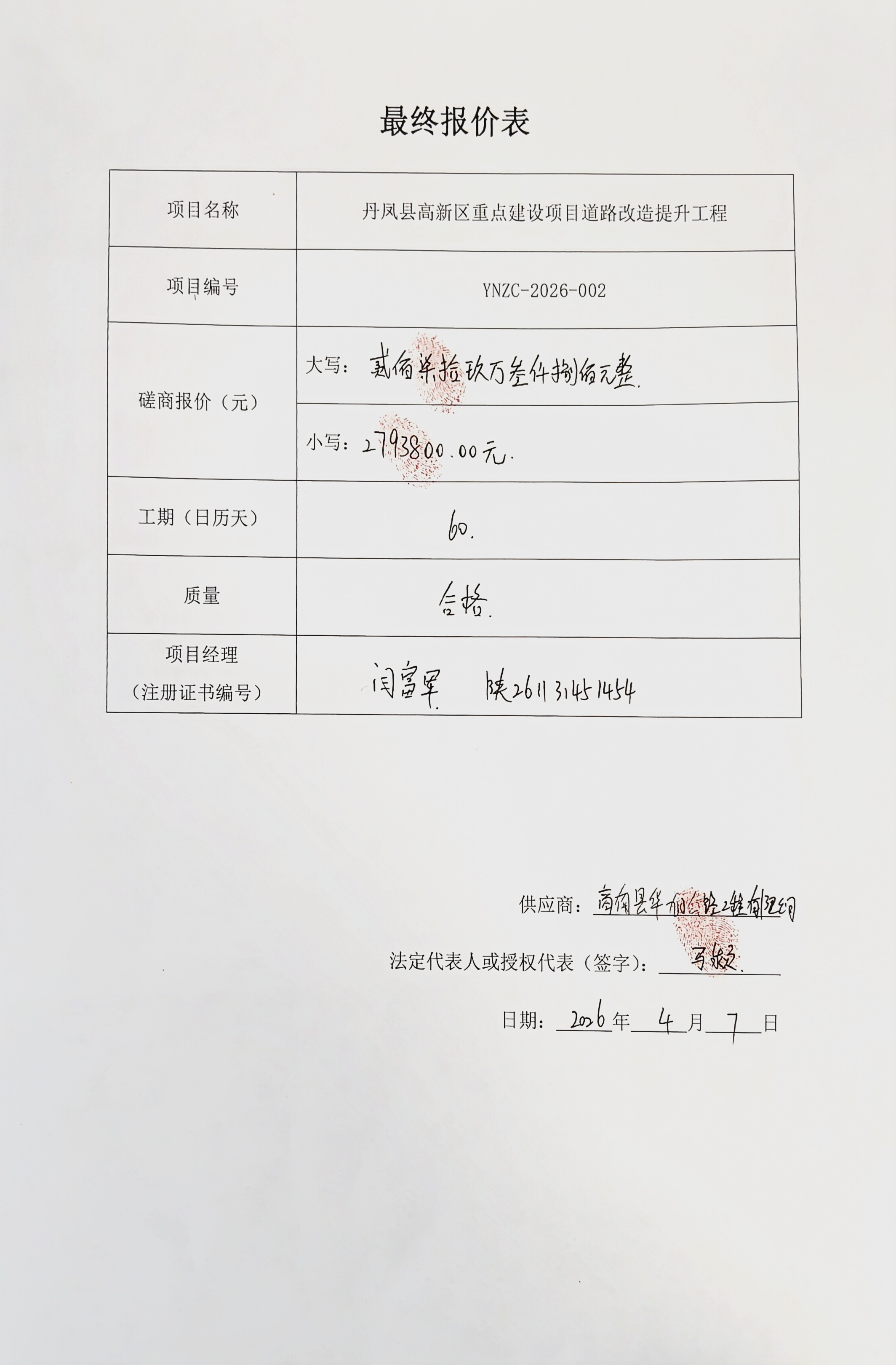 | * | 公路工程施工 | 丹凤县高新区重点建设项目道路改造提升工程 | 磋商文件包含施工范围 | **日历天 | 闫富军 | 陕************ | *,***,***.** |