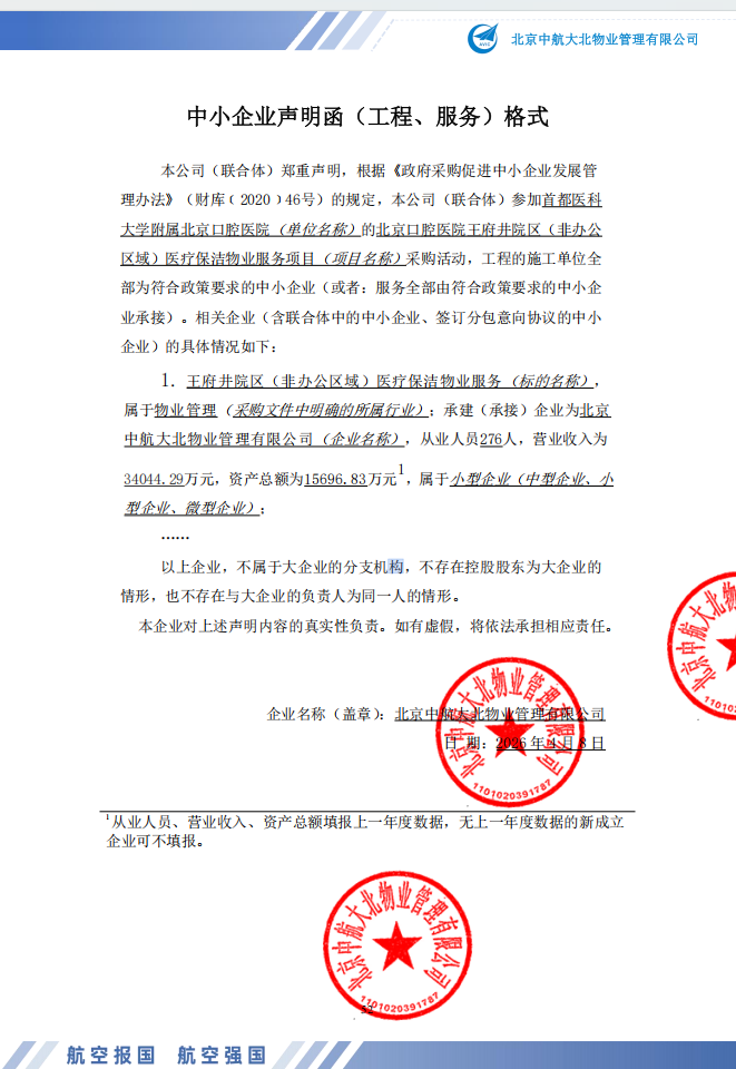 中标成交供应商名称:北京中航大北物业管理有限公司