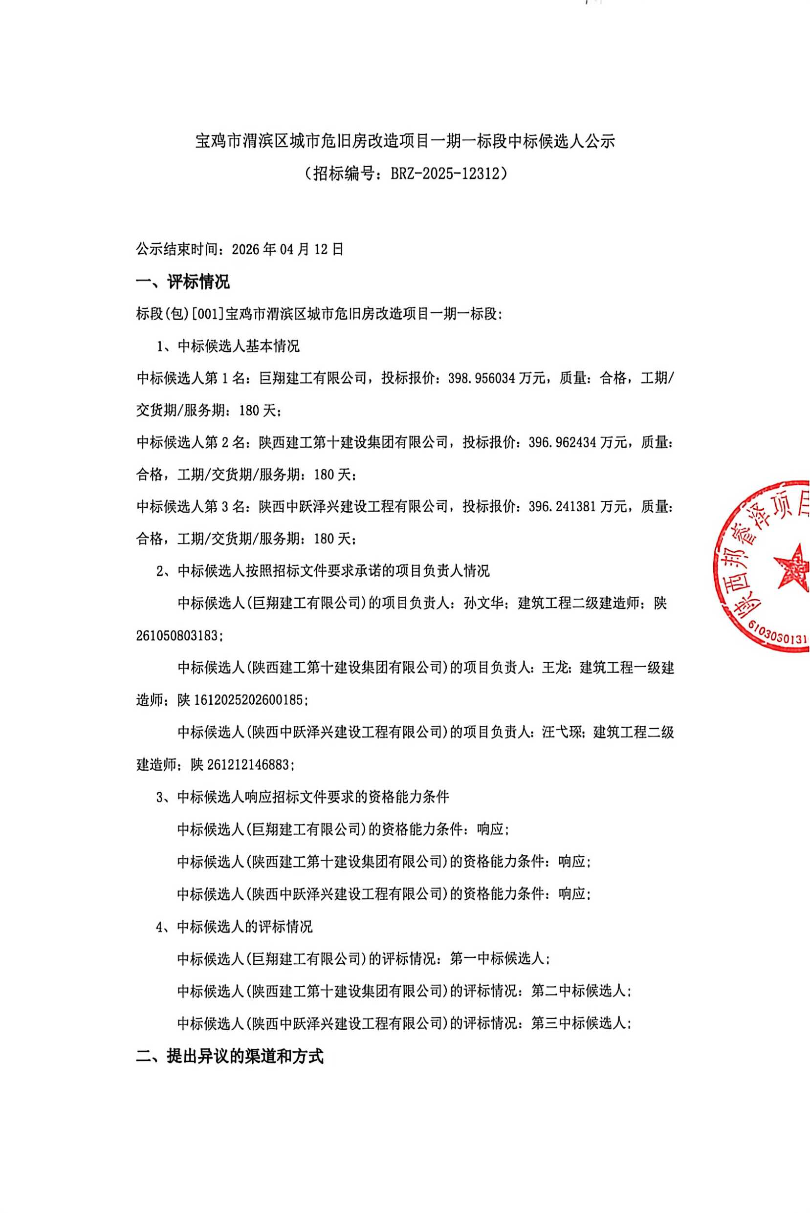 宝鸡市渭滨区城市危旧房改造项目一期一标段中标候选人公示