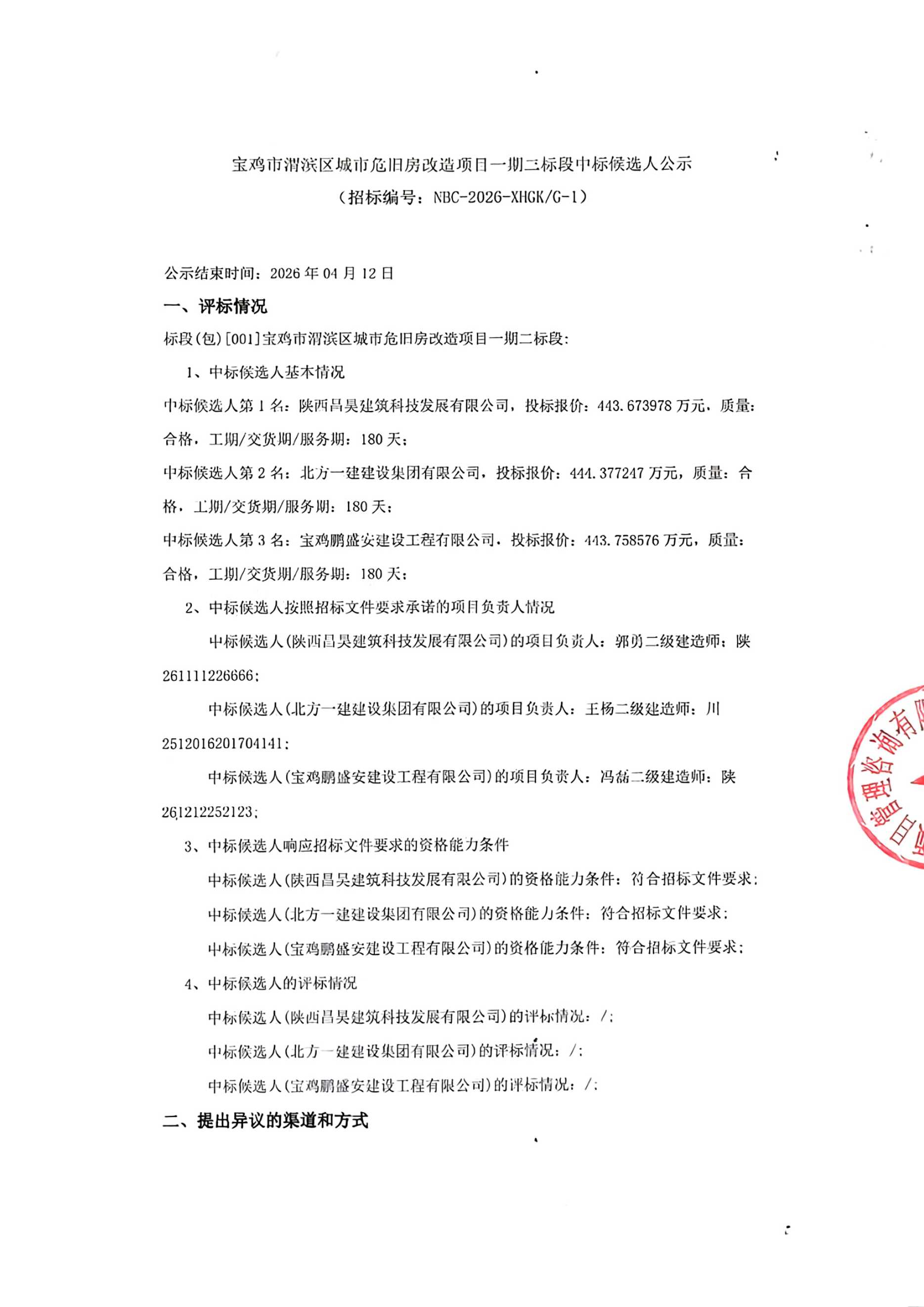宝鸡市渭滨区城市危旧房改造项目一期二标段中标候选人公示