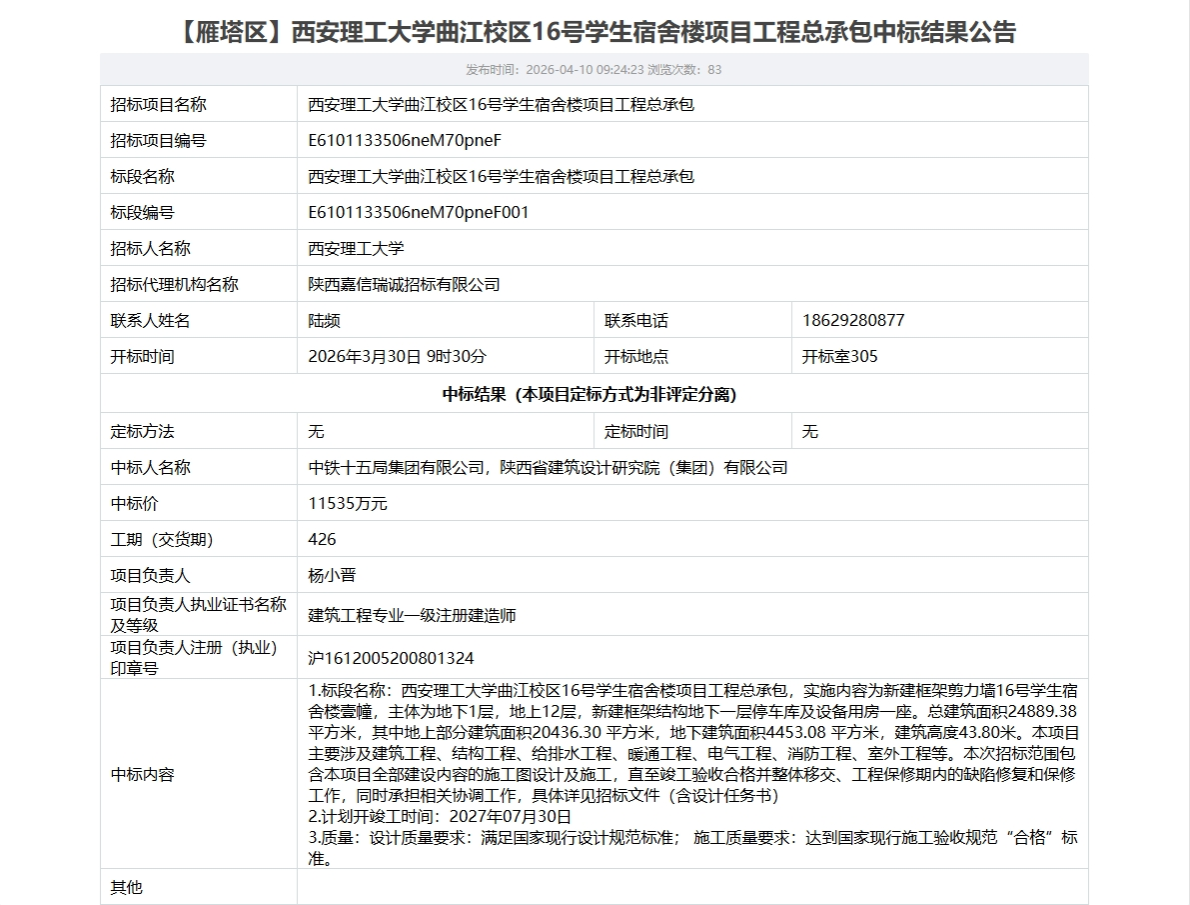 【工程总承包】西安理工大学曲江校区16号学生宿舍楼项目工程总承包中标结果公告