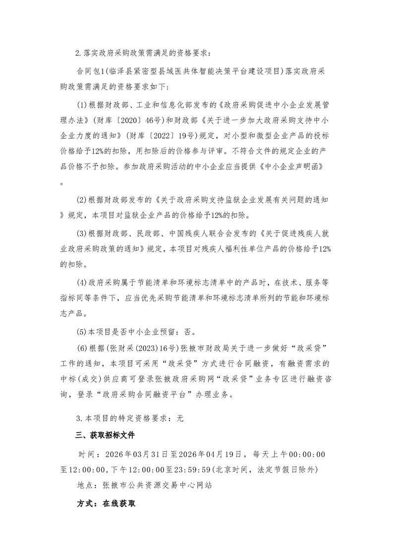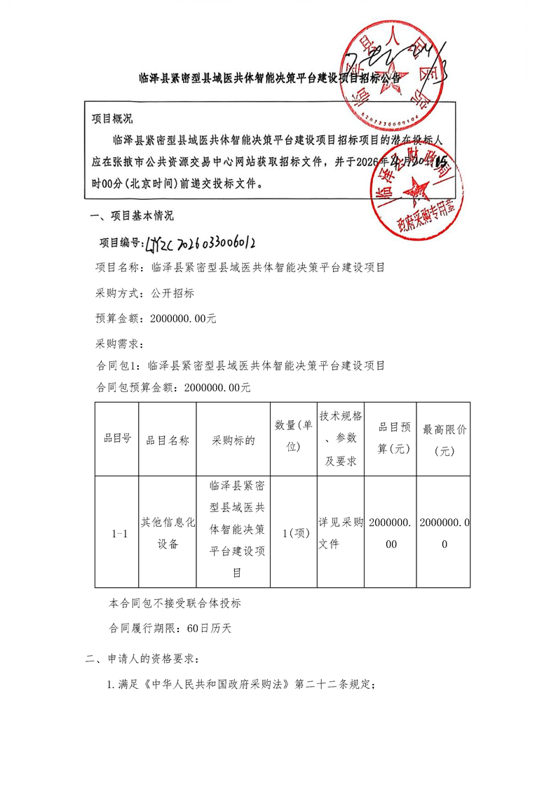 【正常公告】临泽县紧密型县域医共体智能决策平台建设项目招标公告