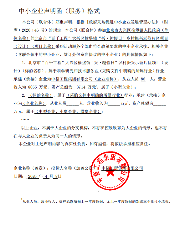 项目用途:北京市“百千工程”大兴区榆垡镇“兴·趣假日”乡村振兴示范片区项目(设计)简要技术参数:本项目的设计工作、技术交底以及施工阶段配合工作等相关的所有设计服务等内容。合同履行日期:**日历天