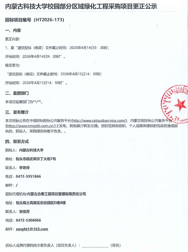 内蒙古科技大学校园部分区域绿化工程采购项目更正公示