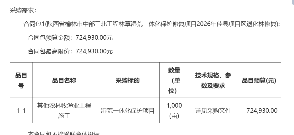 | *** | 其他农林牧渔业工程施工 | 湿荒一体化保护项目 | *,***(亩) | 详见采购文件 | ***,***.** |